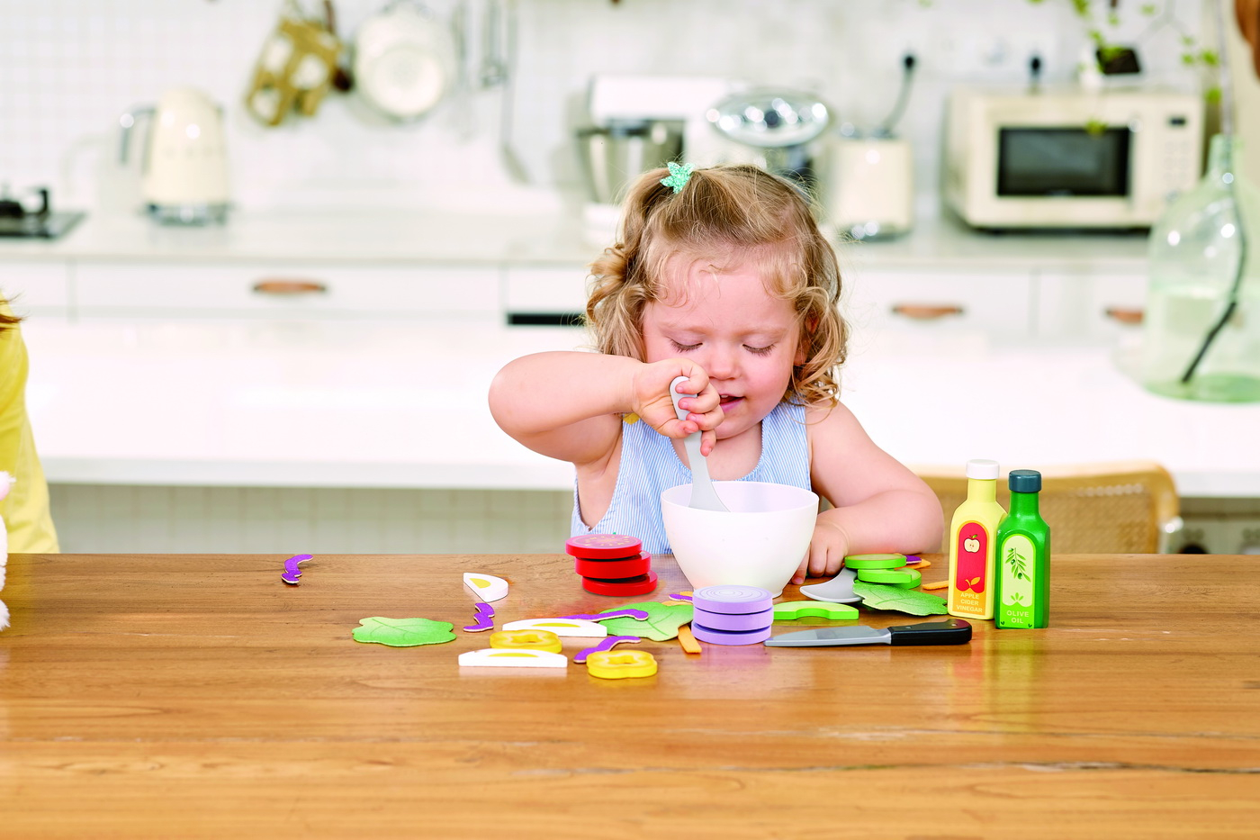 Pregatiti o masa sanatoasa cu acest fantastic set de salata! Include bucati de ou, avocado, castraveti, rosii, ceapa si alte legume care pot fi feliate cu ajutorul cutitului de joc realist. Include, de asemenea, un bol de salata, o lingura si o furculita si doua sticle de sos! Decideti ce tip de salata doriti, apoi taiati ingredientele si adaugati-le in castron. Finalizati cu un pic de dressing si sunteti gata sa mancati sanatos! Marginile rotunde netede sunt perfecte pentru degetele mici de prins si de jucat Excelent pentru dezvoltarea limbajului, a abilitatilor sociale si motorii fine. Jucariile sunt realizate din lemn, folosind materiale ecologice, vopsite in culori atragatoare cu vopsele nontoxice, care depasesc cele mai inalte si stricte standarde internationale de siguranta si calitate, precum EN71, ISO9001, ASTM F963 si altele. De multi ani, Hape a creat jucarii fantastice, de inalta calitate, folosind materiale ecologice si durabile, fiecare produs fiind atent proiectat pentru a stimula abilitatile senzoriale, fizice si emotionale.