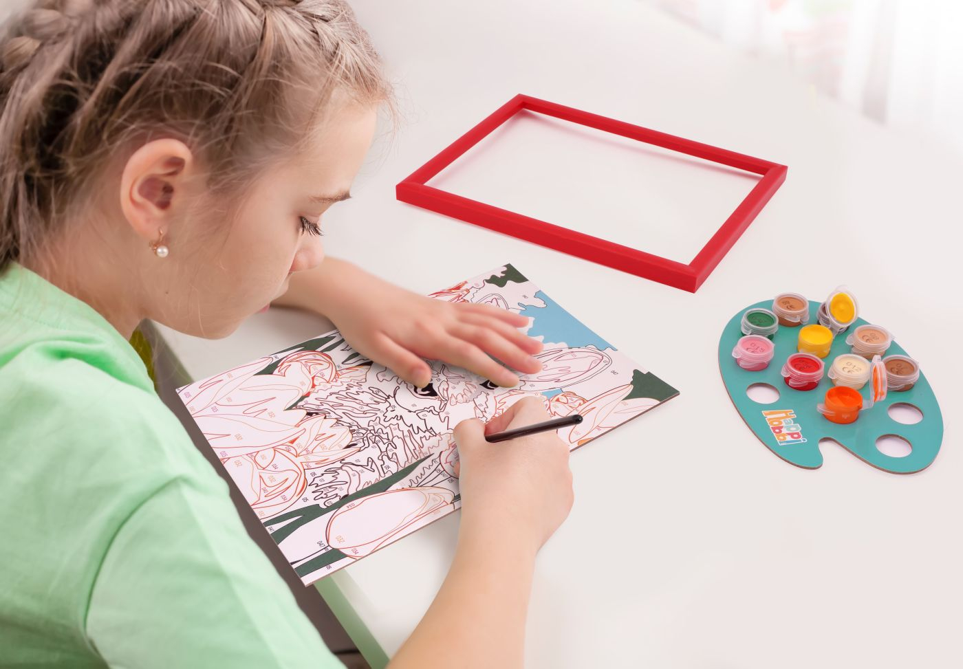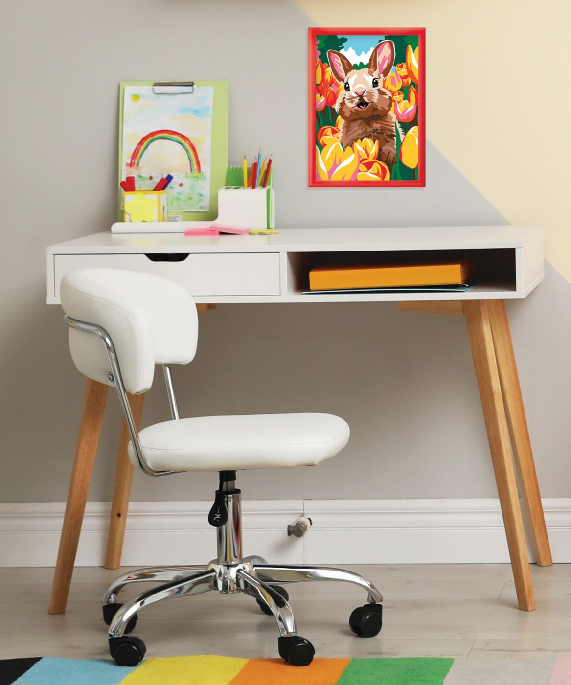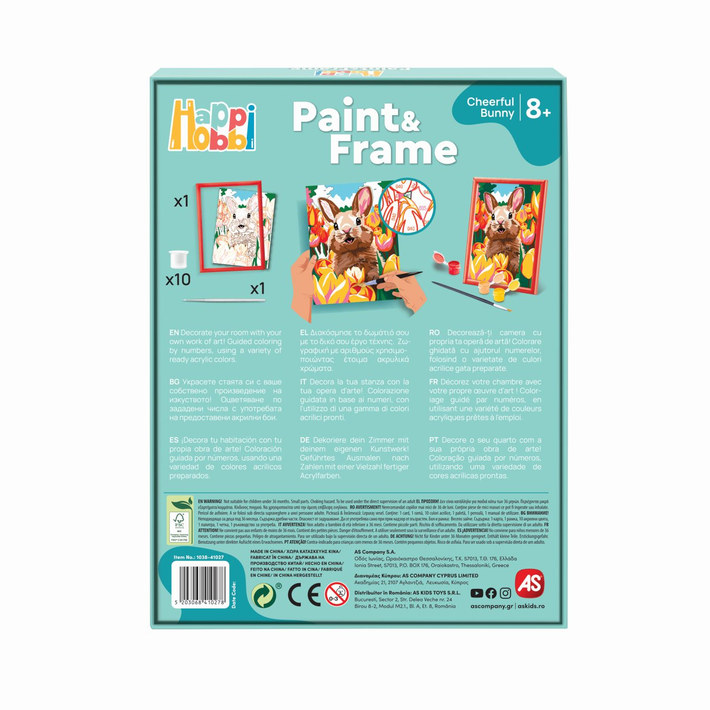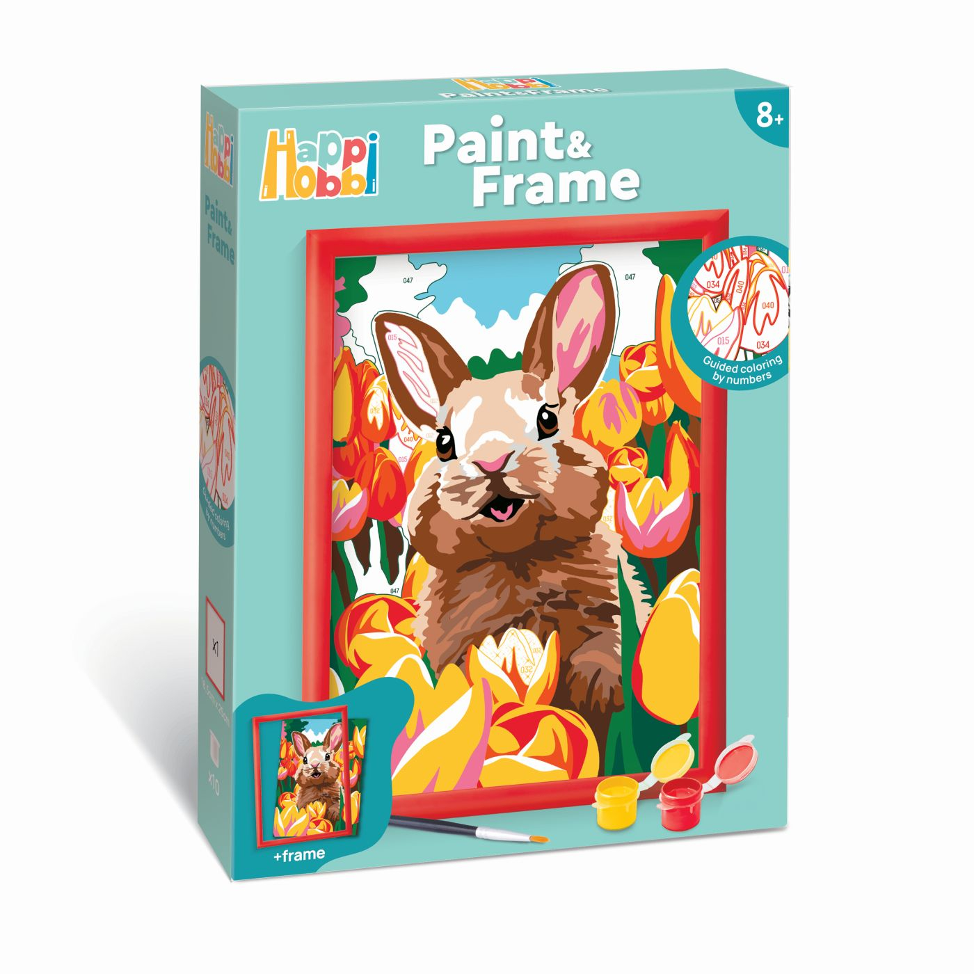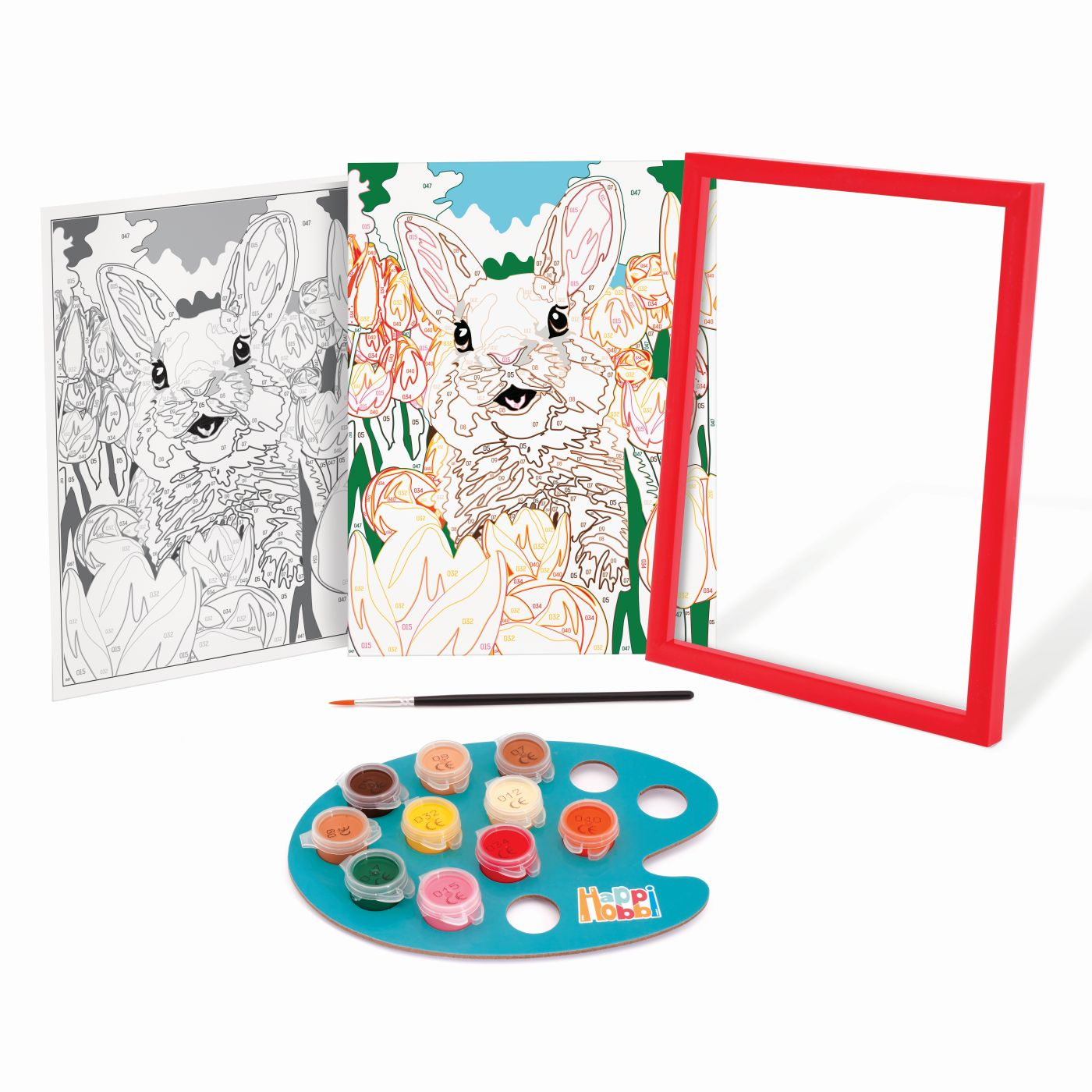 Setul include 1 cartonas preimprimat cu un model de iepuras, 10 vopsele acrilice in borcane de plastic, 1 rama din plastic, 1 pensula. Tema iepuras vesel. Copilul vede ce culoare corespunde fiecarei zone si o picteaza in consecinta. Rezultatul este foarte satisfacator, deoarece colorarea cartonului este ghidata.