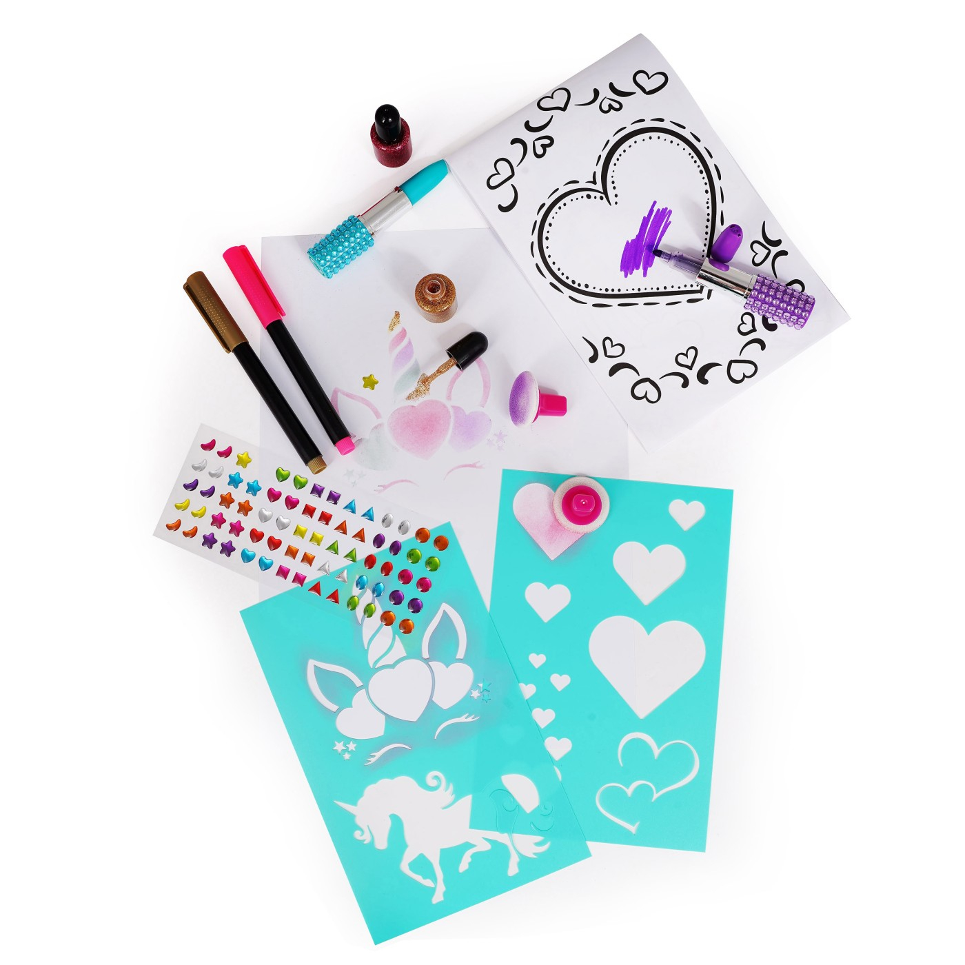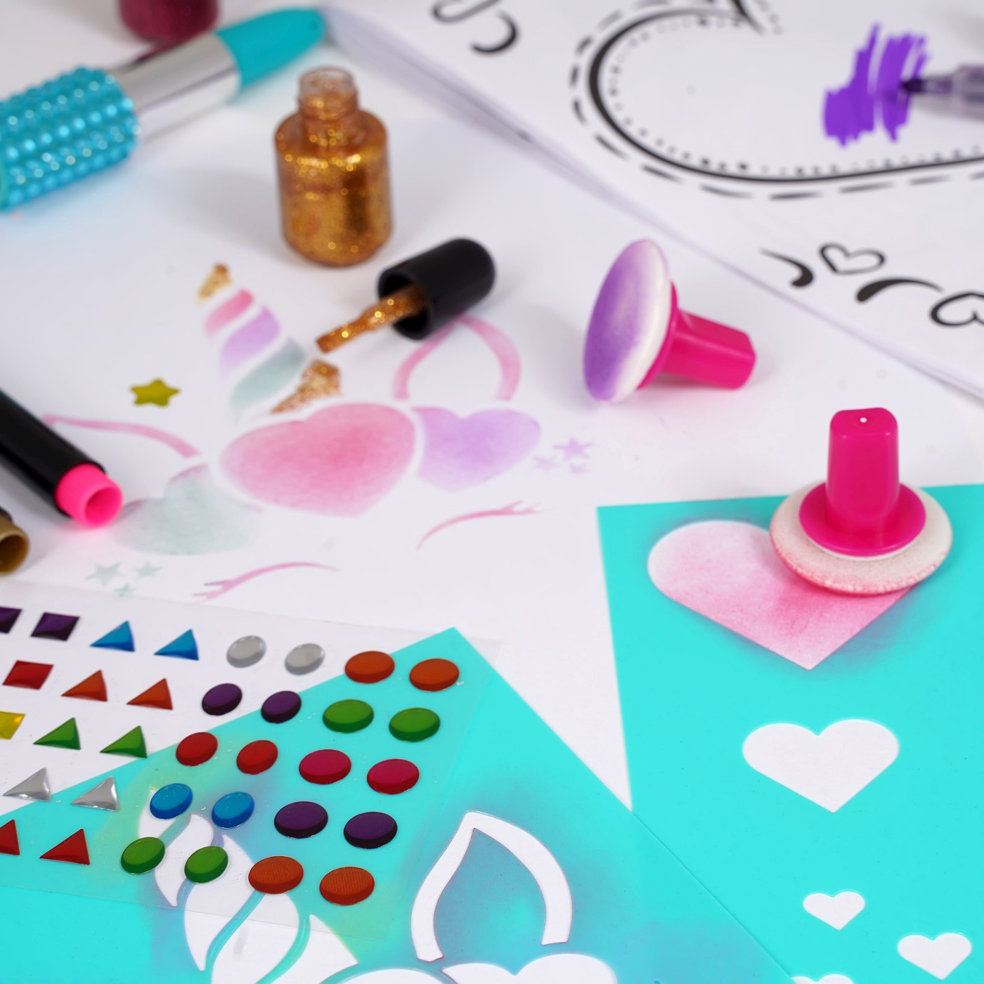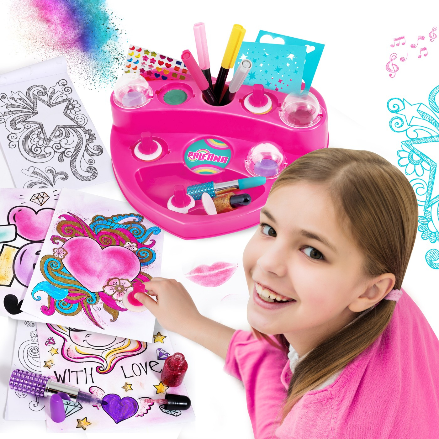 PALETINA, paleta fantastica pentru desen! Vopsele pudra, markere, pensule, sclipici, stickere cu pietre pretioase, bloc de desen si sabloane pentru desene minunate sunt incluse pentru ca cel mic sa deseneze fara sa se opreasca! Deseneaza-ti proprii unicorni, stele, inimi si alte desene magice cu ajutorul pudrelor de pictura si decoreaza-le cu sclipici si autocolante. Rezultatul va va fascina! Acest produs preferat al anilor ྖ este din nou aici, reinnoit si gata sa fie indragit si de tinerele generatii! Este o alegere ideala pentru un cadou, deoarece ii ofera copilului nenumarate optiuni pentru a-si exersa creativitatea cu diverse tehnici de pictura, dezvoltandu-si in acelasi timp imaginatia. Include 1 paleta de pictura in forma de inima, 6 vopsele pudra, 6 pensule burete, 6 foi de sablon, 5 markere (cu sclipici si de culoare), 2 markere ruj, 2 borcane de lipici cu sclipici, bloc de desen si stickere cu pietre pretioase