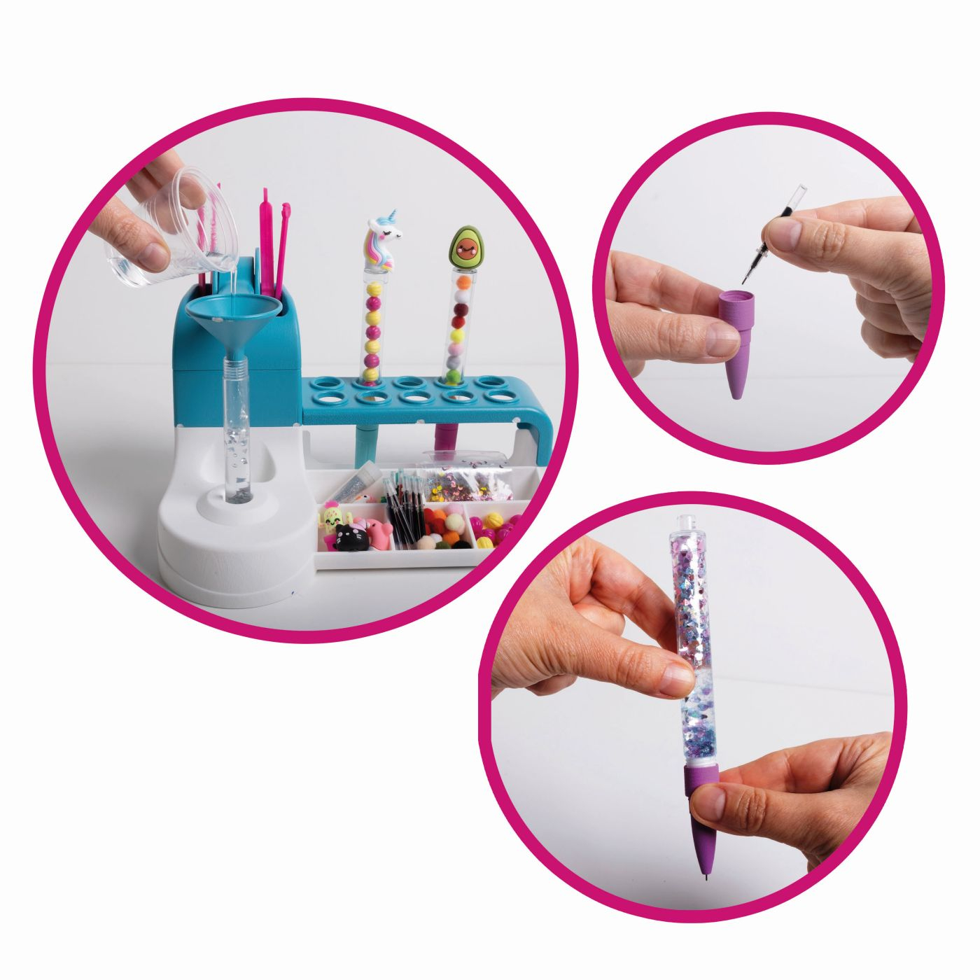 Acest set creativ ofera o modalitate distractiva de a-ti petrece timpul creand o multime de pixuri colorate si decorate. Acesta permite copiilor sa isi creeze si sa isi personalizeze propriile stilouri cu o varietate de accesorii si decoratiuni. O statie de lucru la indemana si un set bogat de instrumente sprijina activitatile de joaca, avand rezultate uimitoare. Acest studio de creatie nu numai ca incurajeaza creativitatea, ci si dezvolta abilitatile practice si cognitive ale copiilor, permitandu-le sa se bucure de procesul creativ si sa creeze propriile lor opere de arta functionale. Setul contine baza din plastic si accesorii pentru depozitarea elementelor si a creioanelor pe care le creati, palnie si instrumente, protectii antiderapante, 10x recipiente, dopuri, capace, 12x cartuse de cerneala in diferite culori, sclipici, margele,10 figurine din cauciuc, manual de intructiuni.