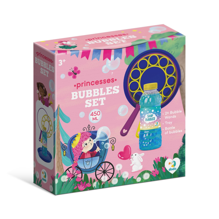 Set de baloane de sapun 450 ml, Printese. Copiii pur si simplu adora sa se joace cu aceste bule, care le aduc o distractie si o bucurie incredibile. Lasati-i pe cei mici sa se cufunde in lumea minunata a jocului cu baloanele de sapun Printese si vedeti-i cum se distreaza si zambesc. Turnati o cantitate mica de solutie intr-un bol. Introduceti complet bagheta de suflare in lichid. Ridicati incet bagheta, asigurandu-va ca membrana solutiei de sapun este intinsa peste toate cercurile baghetei.Fluturati bagheta prin aer pentru a face baloane. Pachetul contine o sticla de 450 ml cu solutie pentru baloane de sapun, o farfurie din plastic si 2 forme de suflare. Compozitia solutiei apa si surfactanti. solutia este non-toxica.