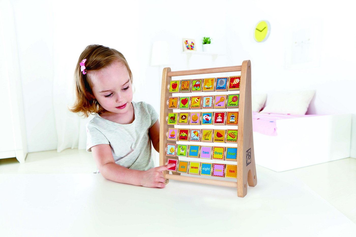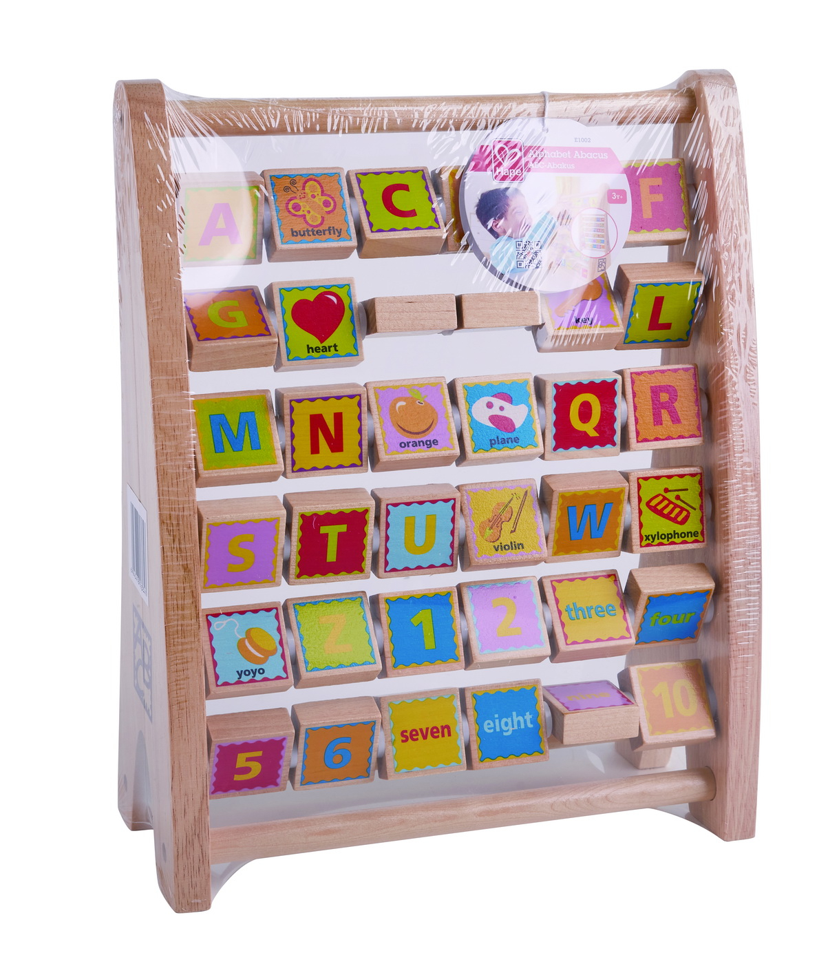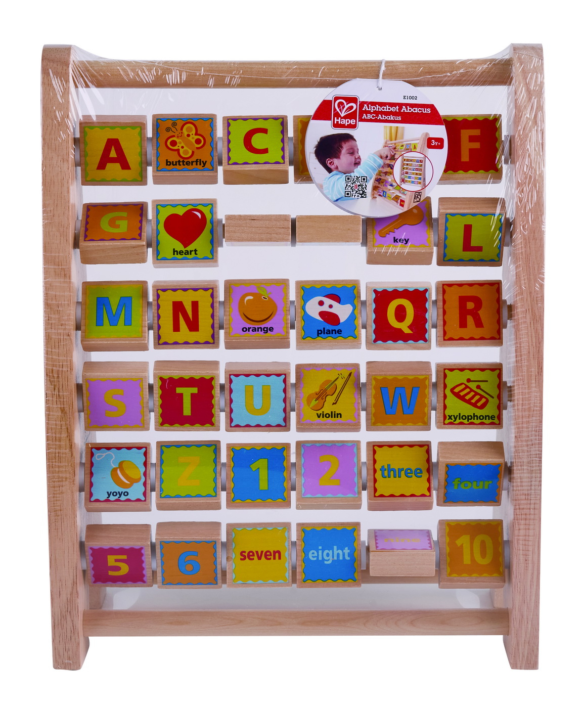 Micutii se vor bucura in timp ce descopera alfabetul cu litere si cifre capricioase care se rotesc pe acest abac. Modelul cuprinde patratele din lemn care au afisate pe o parte o litera, iar pe cealalta parte ilustreaza elementul descriptiv corespunzator literei (in limba engleza). Mamele iubesc durabilitatea blocurilor din lemn de artar. Incurajeaza-ti copilul si povesteasca o poveste pe masura ce intoarce patratelele si aseaza litere si poze ce apatin animalelor vizualizate. Jucariile sunt realizate din lemn, folosind materiale ecologice, vopsite in culori atragatoare cu vopsele nontoxice, care depasesc cele mai inalte si stricte standarde internationale de siguranta si calitate, precum EN71, ISO9001, ASTM F963 si altele. De multi ani, Hape a creat jucarii fantastice, de inalta calitate, folosind materiale ecologice si durabile, fiecare produs fiind atent proiectat pentru a stimula abilitatile senzoriale, fizice si emotionale.
