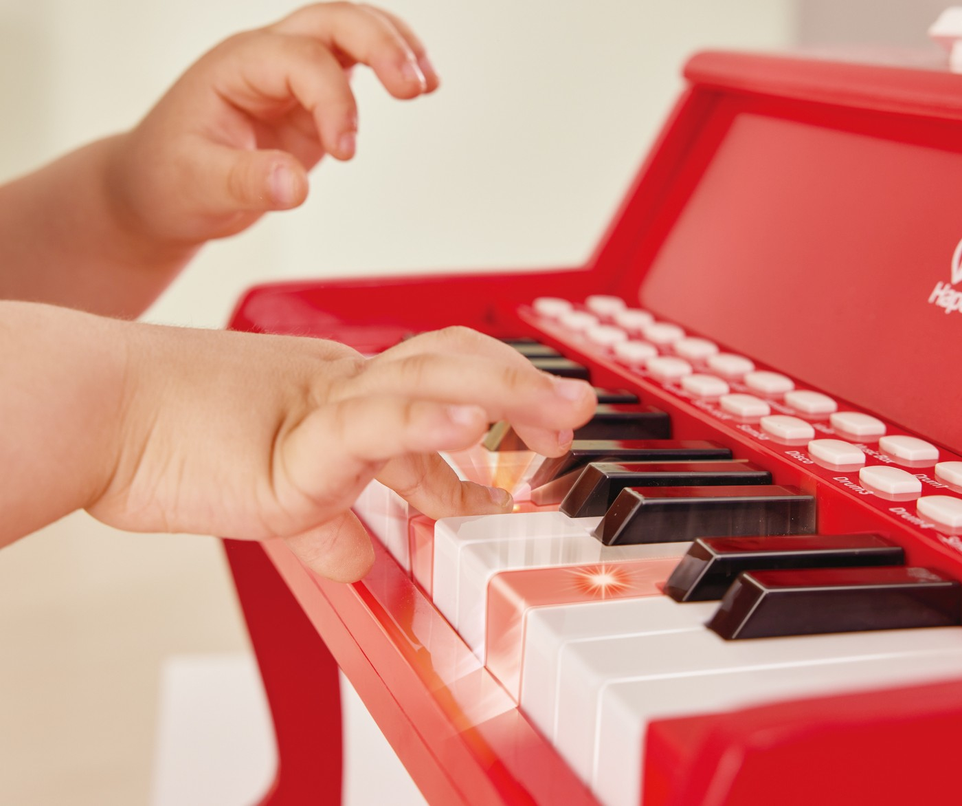 Pianul electronic cu 25 de clape si scaunul confortabil va ajuta sa le faceti introducerea celor mici in marea lume a muzicii. Primele piese pot fi invatate cu usurinta cu ajutorul clapelor luminate. Sunete de instrumente multiple, 6 melodii usor de cantat si 8 batai de tobe. Datorita luminii clapelor, primele piese pot fi redate fara cunostinte de muzica. Copilul devine rapid mai increzator si poate canta una dintre cele 6 melodii frumoase si poate alege una dintre cele 8 batai de tobe. Propriile tale piese muzicale pot fi inregistrate si redate. Jucariile sunt realizate din lemn, folosind materiale ecologice, vopsite in culori atragatoare cu vopsele nontoxice, care depasesc cele mai inalte si stricte standarde internationale de siguranta si calitate, precum EN71, ISO9001, ASTM F963 si altele. De multi ani, Hape a creat jucarii fantastice, de inalta calitate, folosind materiale ecologice si durabile, fiecare produs fiind atent proiectat pentru a stimula abilitatile senzoriale, fizice si emotionale.