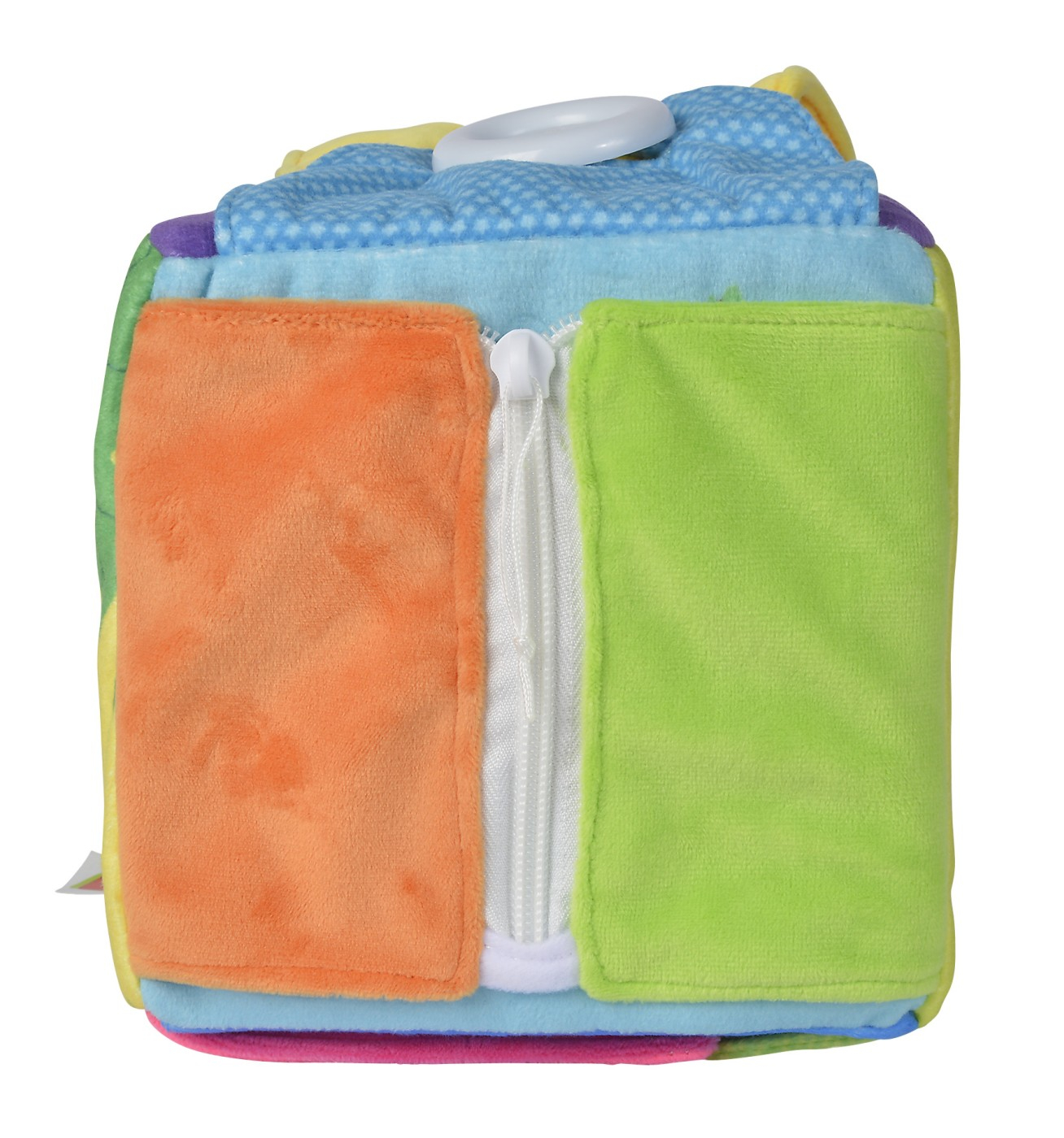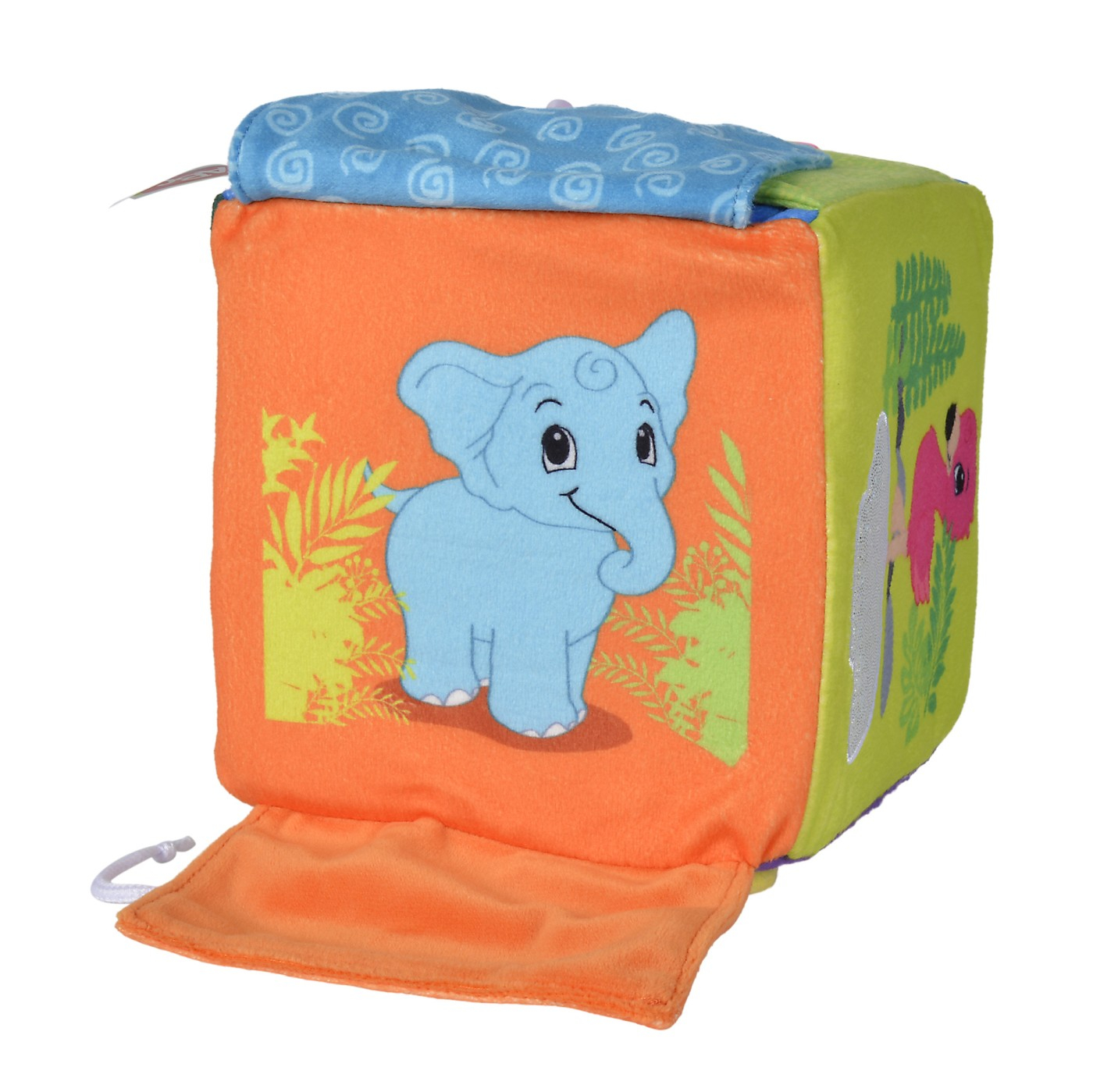 Cub din spuma, cu laturile de 13 cm si imagini cu animale dragute. 4 dintre laturi au diferite sisteme de inchidere.