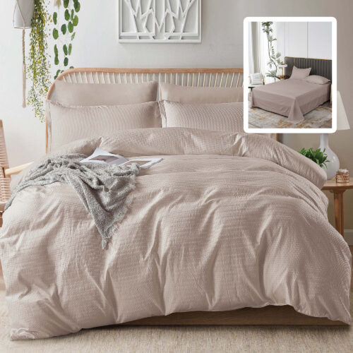 Lenjerie de pat creponată uni 6 piese cu husă (cappucino)