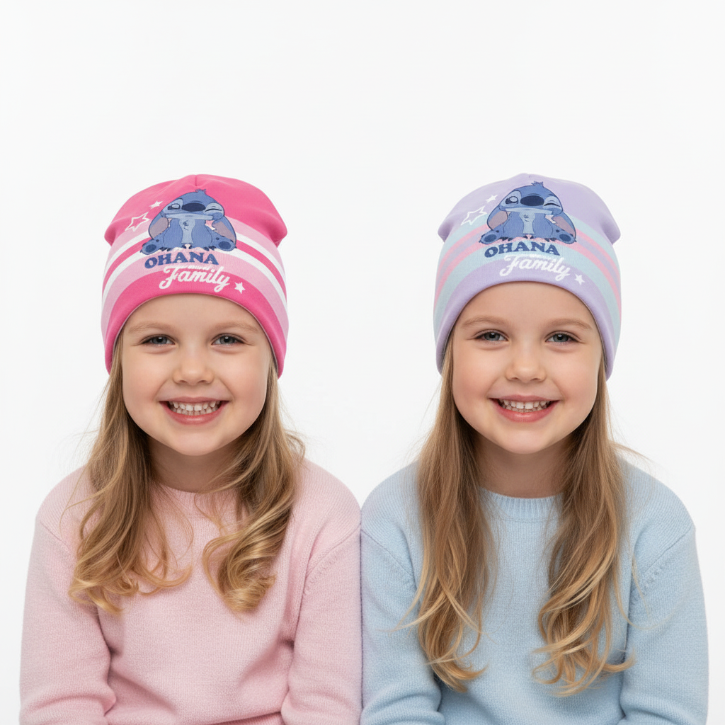Căciulă pentru copii cu Stitch și mesajul „Ohana Family”, ideală pentru sezonul rece.