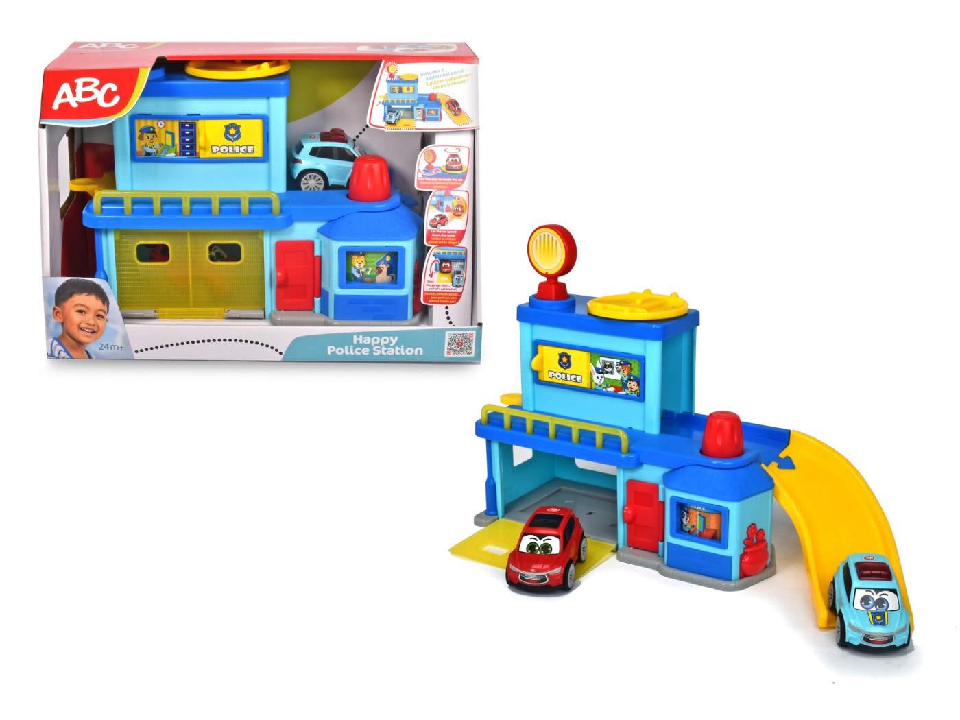 Sectie de politie cu rampa de pornire si platforma rotativa pentru masini, lansator de masini, usa de garaj cu deschidere si usa care se deschide spre camere. Setul include si 2 masinute.