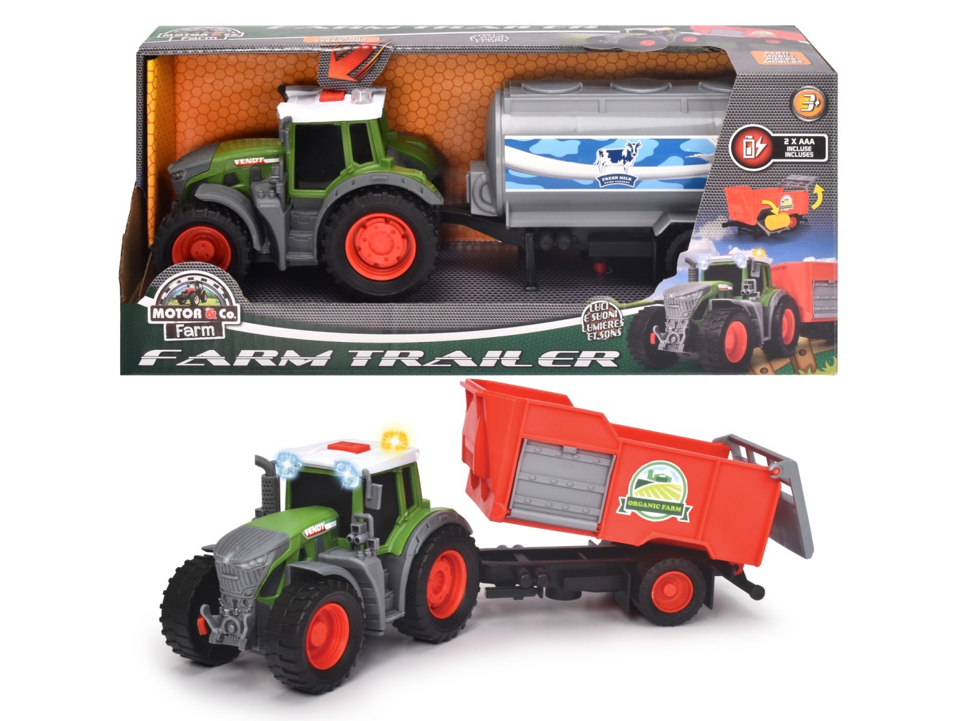 Tractor Dickie cu licenta Fendt, cu remorca ce se poate bascula, sunet si lumina, lungime 26 cm.Acest tractor cu o remorca mare este un must-have in orice ferma. Are licenta oficiala Fendt si este un cadou perfect pentru toti fanii modelelor de vehicule.Avand culori stralucitoare si un design complex de detaliu, vehiculul sic are, de asemenea, o gama larga de caracteristici distractive. Punctele forte includ efecte de lumina si sunet si roti rotative, precum si o remorca cu functie de inclinare. Anvelopele mari si largi ofera multa aderenta. Setul include si un balot de fan de jucarie si vine cu baterii, astfel incat sa te poti apuca imediat de lucru!