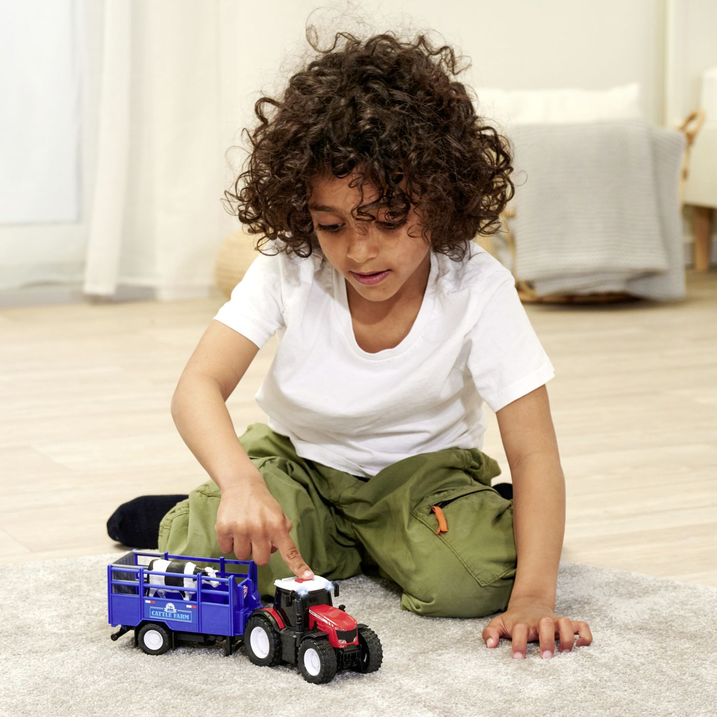 Tractor de jucarie Massey Ferguson cu remorca pentru animale si vaca, cu efecte luminoase si sonore , Lungime 26 cm. Remorca poate fi atasata la spatele tractorului si are o rampa rabatabila pentru incarcarea si descarcarea figurinei. Tractorul este autorizat oficial de catre Massey Ferguson si vine cu efecte de lumina si sunet care pot fi pornite si oprite printr-o simpla apasare a unui buton.