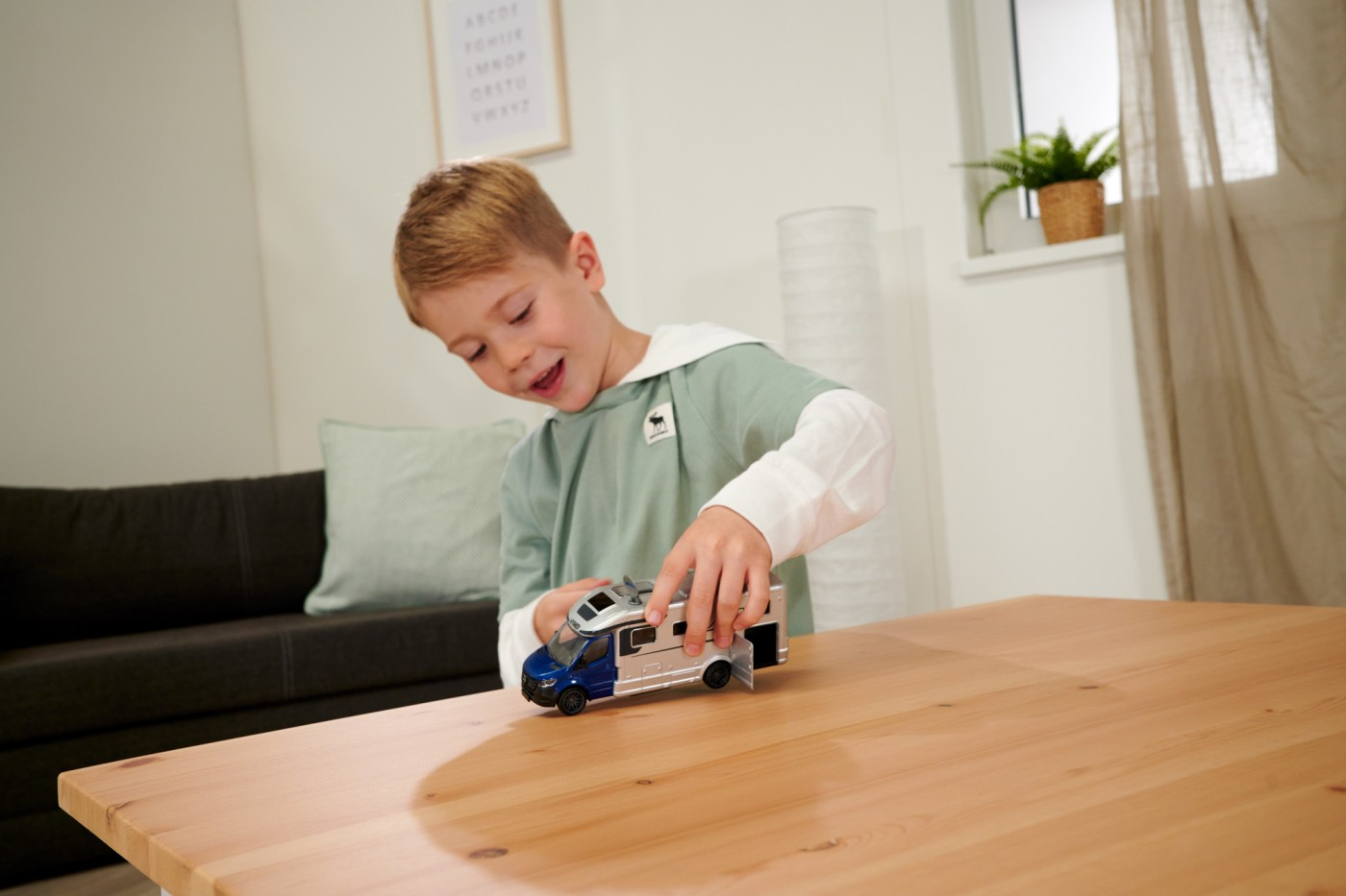 Majorette Camper van HYMER B-Class MasterLine rulota premium la scara 143, vehicul de jucarie pentru colectionari si copii cu varsta de 3 ani si peste. Proiectat pe baza vehiculului original, modelul are o multime de functii practice si realiste pentru a va distra, inclusiv doua efecte sonore diferite, doua faruri si iluminare interioara. De asemenea, dispune de anvelope din cauciuc moale, cu un model de benzi de rulare, ferestre transparente si antena de satelit rotativa pliabila. Atat cabina soferului, cat si sectiunea de rulota sunt realizate din metal. Celelalte parti sunt fabricate din plastic.