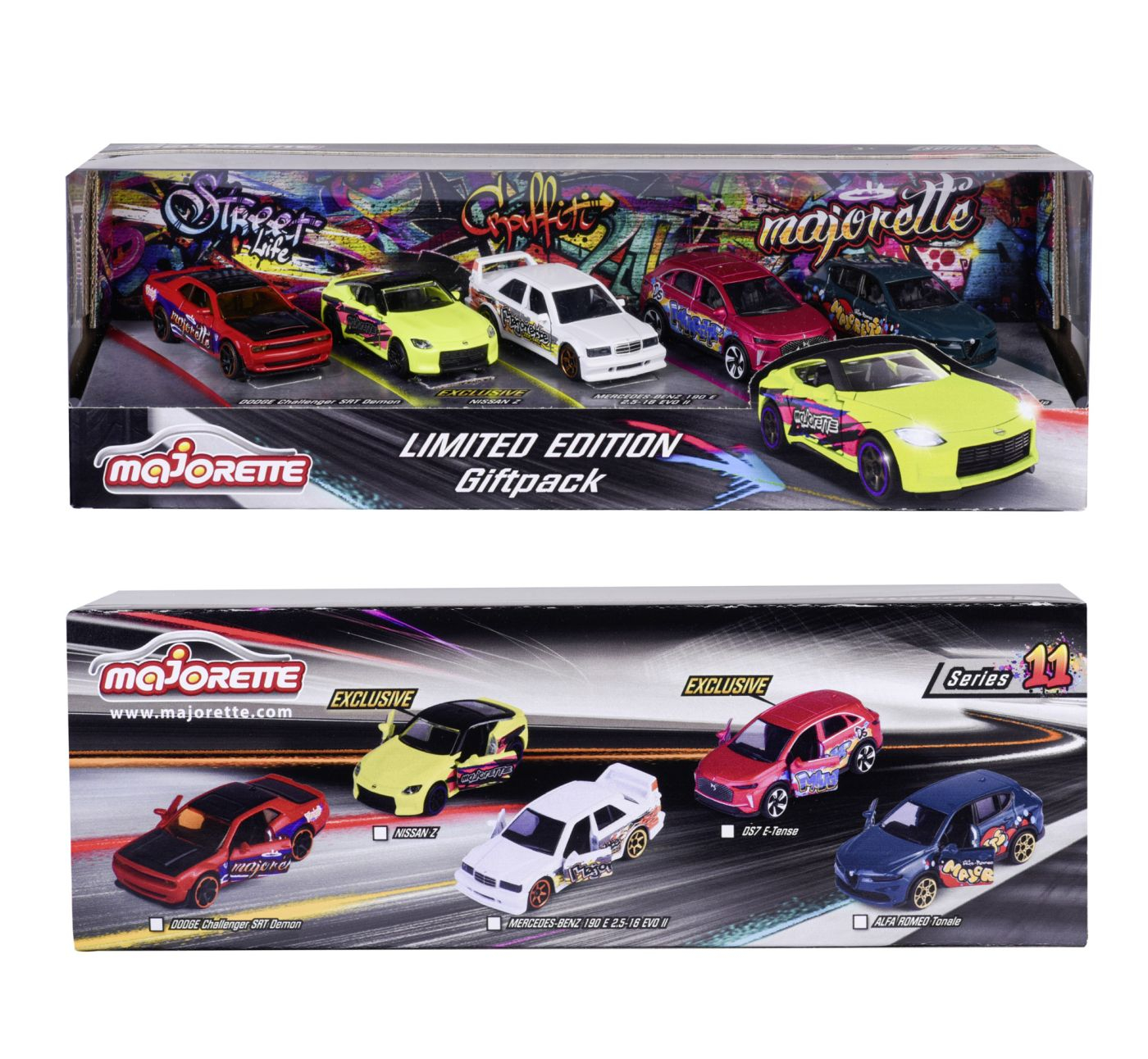 Set de masini Majorette Editie limitata 11 in aspect graffiti (5 masini) - 5 masini model metalic cu roata libera, suspensie si portiune de deschidere, masini de jucarie pentru colectionari si copii de la 3 ani si peste, 7,5 cm fiecare. Puterea se intalneste cu stilul - urban, atragator si inconfundabil acest set de masini Majorette combina 5 vehicule clasice cu licenta intr-un design graffiti individual - cu culori stralucitoare si etichete cool! Setul cadou contine 3 modele premium ale Editiei limitate 11 (Dodge Challenger SRT Demon, Mercedes-Benz 190E 2.5-16 Evo II si Alfa Romeo Tonale) precum si 2 masini speciale, ce pot fi gasite doar in acest set Nissan Z in galben neon si DS7 E-Tense in roz - desigur si cu graffiti!