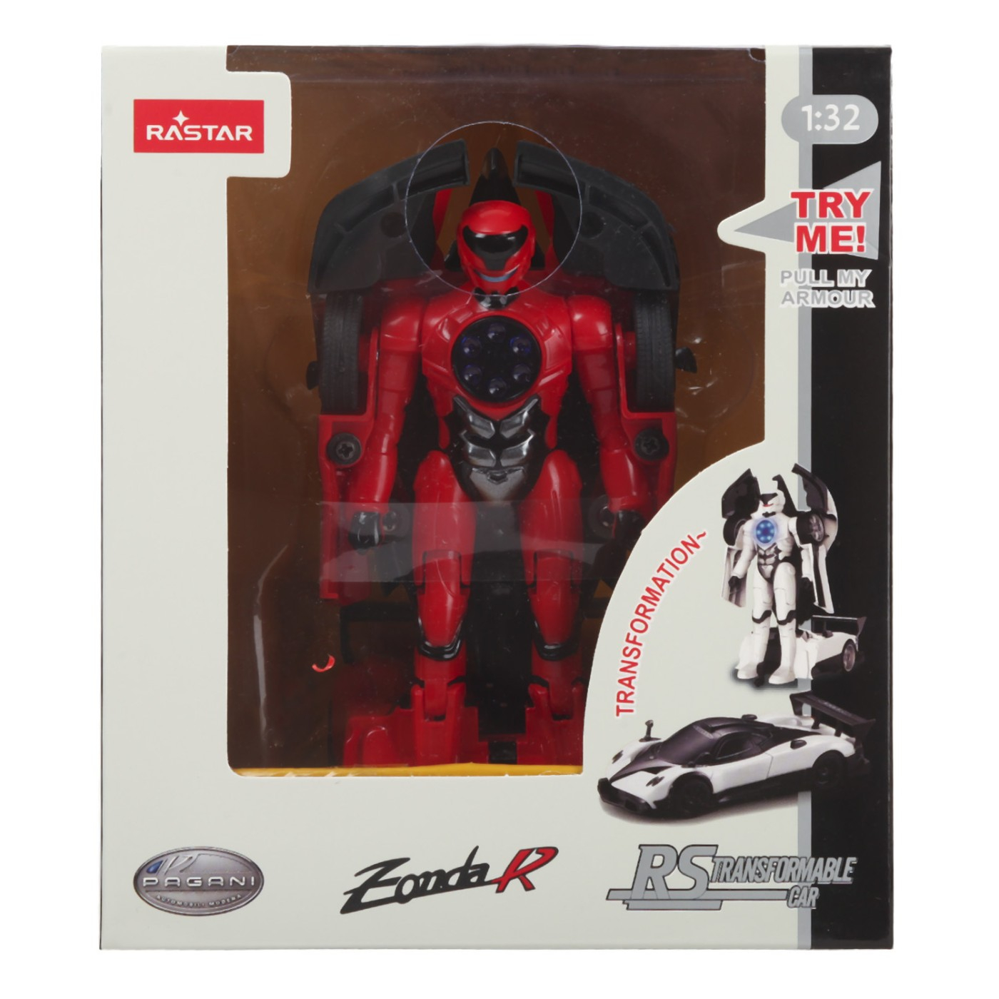 Masinuta Pagani Zonda R Transformable este gata de a iesi din cutie! Poate fi masinuta sau robot! Efecte luminoase si sunete in timpul miscarii.Masinuta are proportiile ideale pentru momente pline de distractie si amuzament, avand dimensiunile in centimetri dupa cum urmeaza 13.5*9.5*15.5cm. Masinuta metalica Pagani Zonda R, scara 1 la 32, are anvelope de cauciuc si un design detaliat interior-exterior realizat din material metalic turnat cu accesorii realizate din material plastic portiere de calitate superioara. Copilul dumneavoastra se poate juca in voie cu masina metalica Pagani Zonda R oferita de brandul international Rastar. Nicio cursa nu este imposibil de castigat cu acesta masinuta, care este o replica oficiala cu licenta a modelului original, construita cu mare atentie la detalii. Pasionatii si colectionarii de machete metalice pot de asemenea aprecia aceasta macheta metalica.
