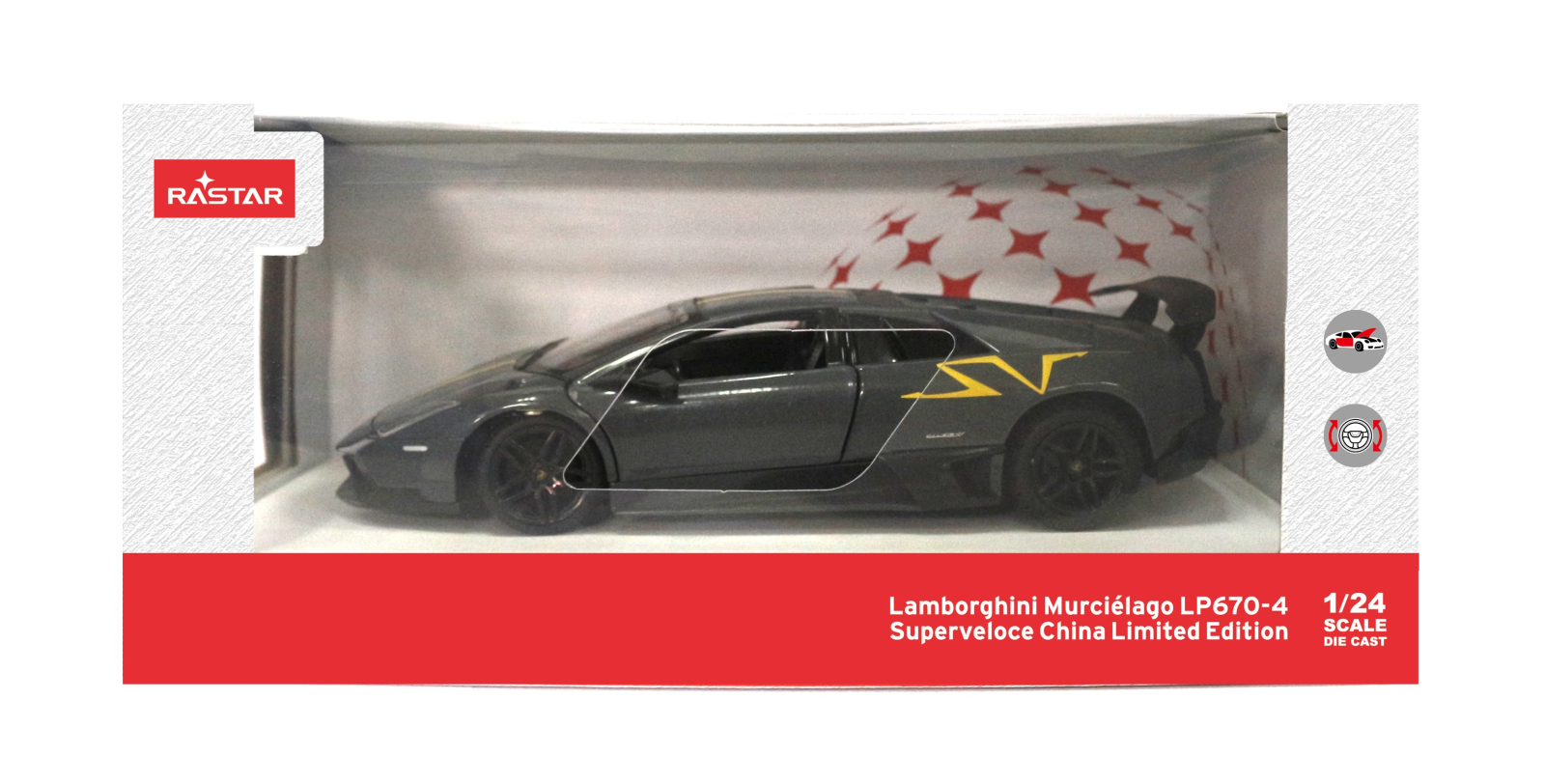 Masinuta are proportiile ideale pentru momente pline de distractie si amuzament, avand dimensiunile in centimetri dupa cum urmeaza 19.6*9.3*5. Masinuta metalica Lamborghini Murcielago, scara 1 la 24, are anvelope de cauciuc si un design detaliat, interior-exterior, realizat din materiale metalice turnate cu accesorii realizate din material plastic de calitate superioara. Copilul dumneavoastra se poate juca in voie cu masina metalica Lamborghini Murcielago de la brandul international Rastar. Nicio cursa nu este imposibil de castigat cu acesta masinuta, care este o replica oficiala cu licenta a modelului original, construita cu mare atentie la detalii. Pasionatii si colectionarii de masini pot de asemenea aprecia aceasta macheta metalica.
