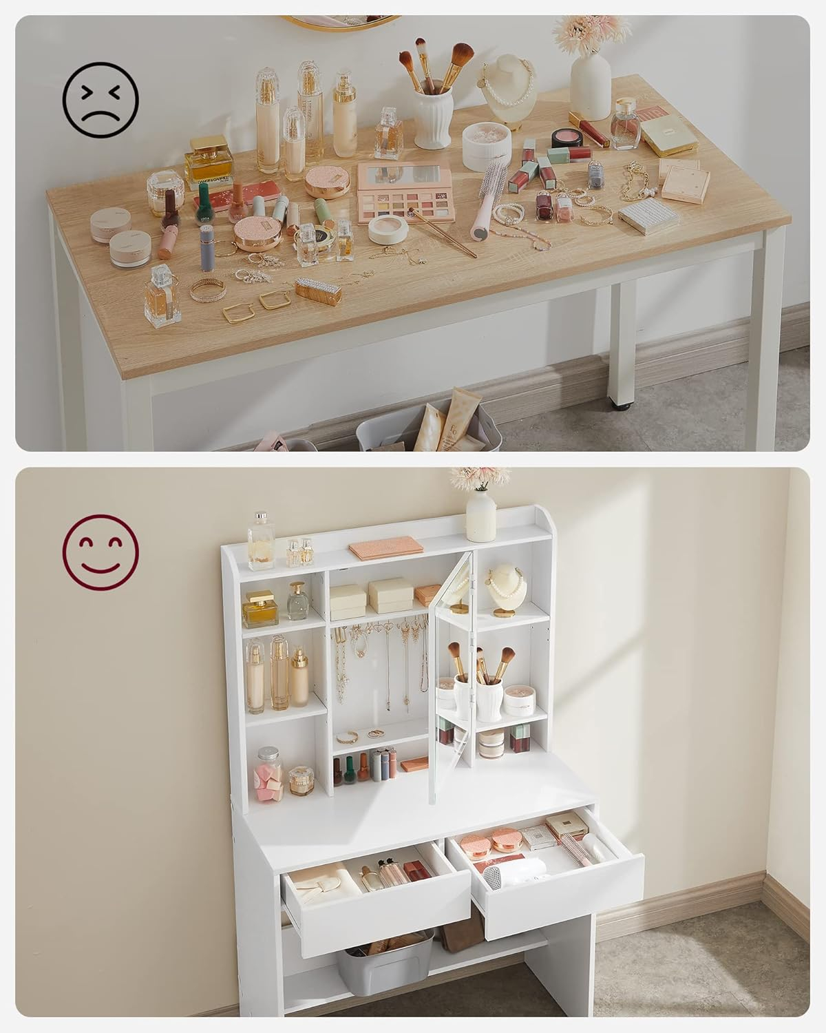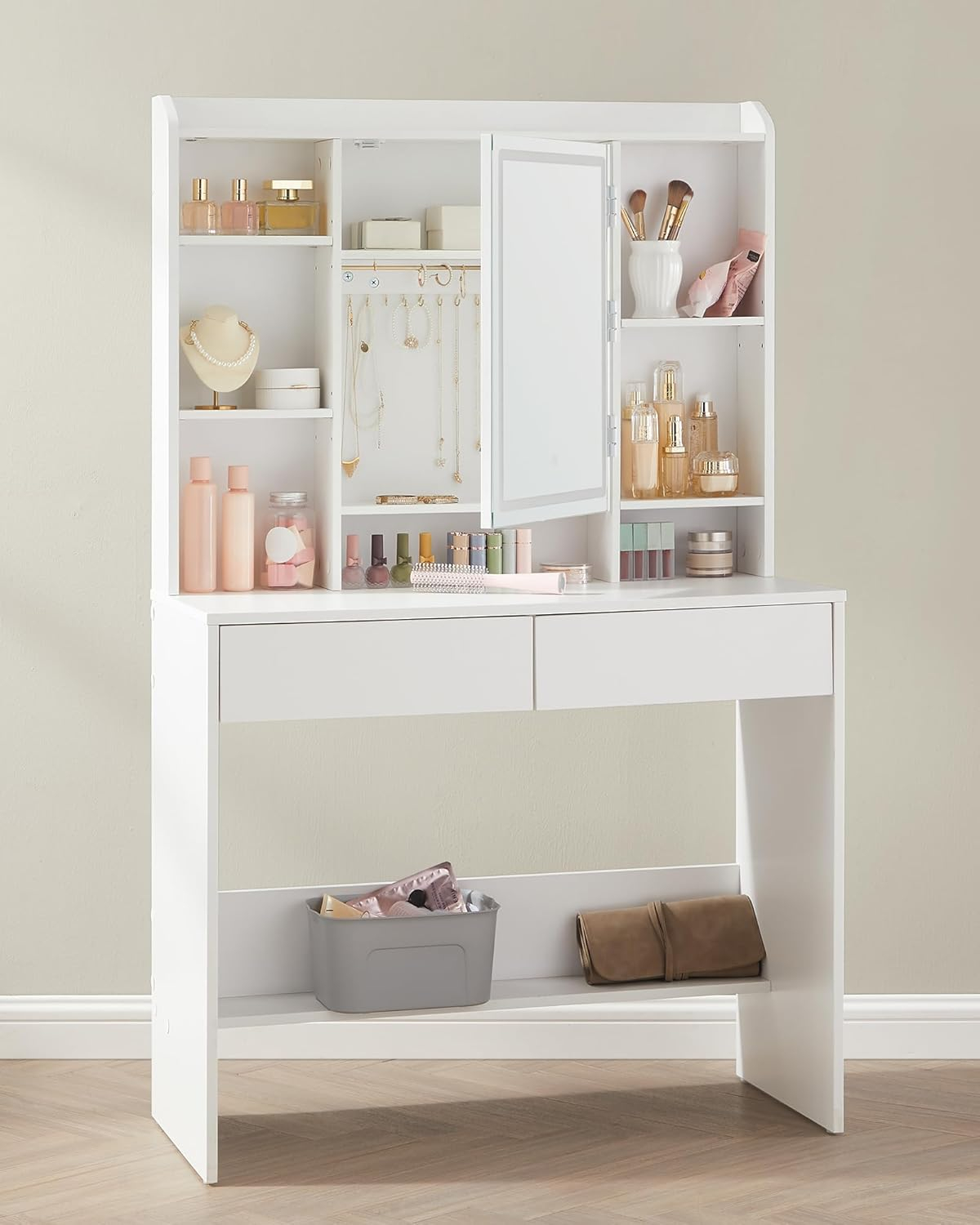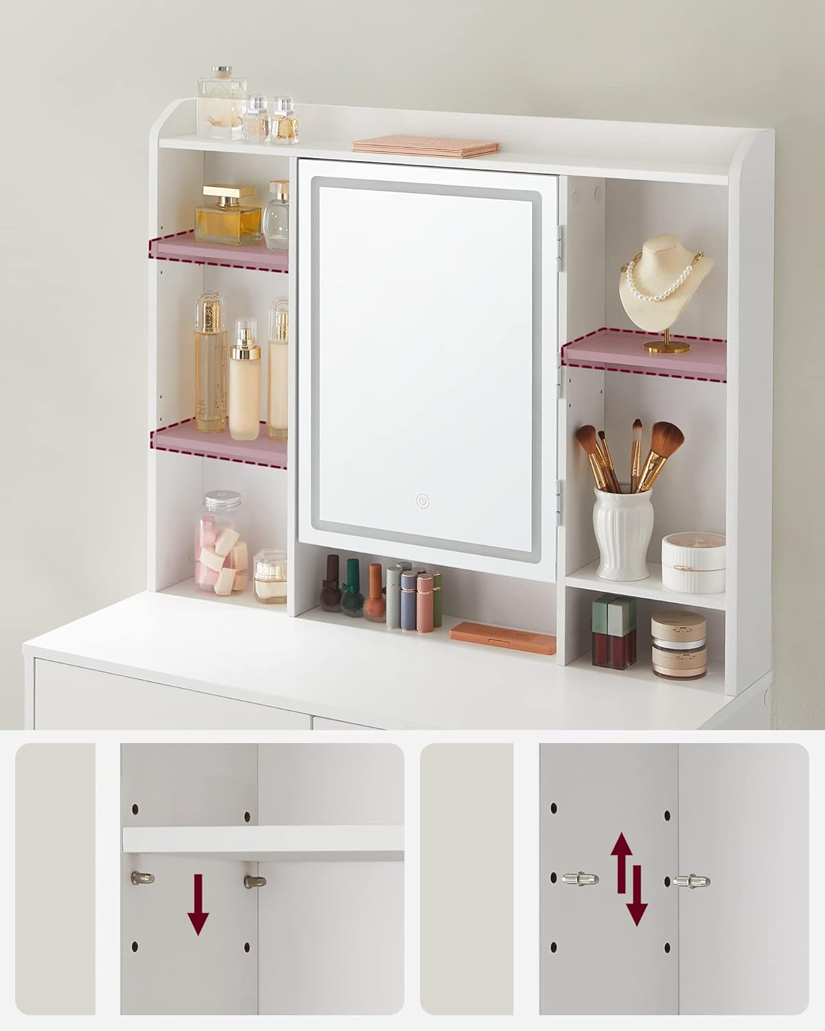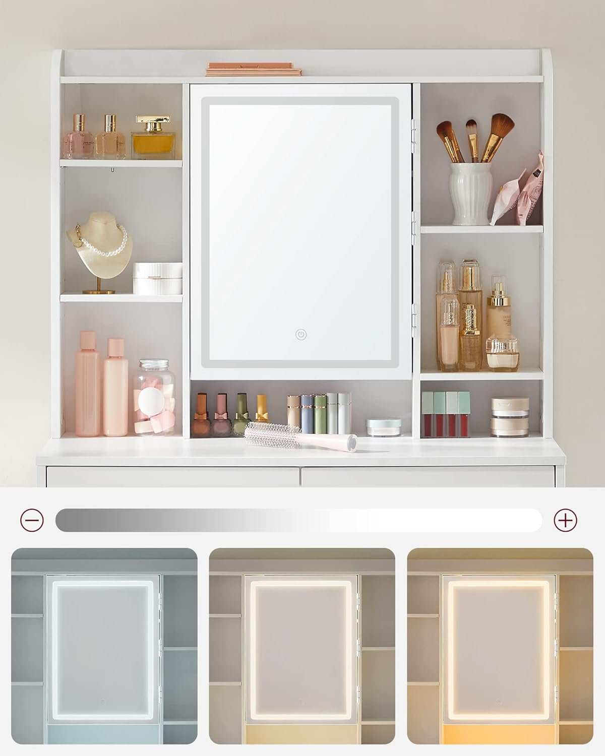 Necesita asamblare DaAdancimea articolului 40.0 cmProducator VASAGLEDimensiunile produsului 40 x 90 x 144,7 cm;Greutatea produsului 31.6 KilogrameIluminare LED - cu intensitate reglabila 3 culori de lumina - cald, rece, neutruMaterial PAL Mare si incapatoare: 1 raft in partea de sus pentru parfumurile dvs., 7 compartimente deschise pentru cosmeticele dvs., 2 compartimente si carlige in spatele oglinzii, 1 blat de masa, 2 sertare si 1 raft in partea de jos, aceasta masuta de toaleta va ofera un spatiu considerabil Iluminare led reglabila:  Apasati butonul tactil pentru a schimba culorile luminii, apasati butonul pentru cateva secunde pentru a regla luminozitatea, totul este pus impreuna pentru a va machia rapid Raft reglabil pentru diferite produse: cele 2 placi din stanga si placa din mijloc din dreapta sunt reglabile la 3 inaltimi, pentru a va gazdui produsele de diferite dimensiuni, cum ar fi creme de fata, seruri, fundatii, demachiante si multe altele Stabil si durabil Realizata din PAL de calitate, aceasta masa de machiaj este stabila si durabila in timp. Suprafata sa este rezistenta la uzura si usor de curatat, va va insoti pentru multi ani de acum inainte Stil simplu si modern Designul simplu, liniile curate si albul pur dau viata acestei mese de machiaj moderne care va aduce o nota de eleganta dormitorului dvs.