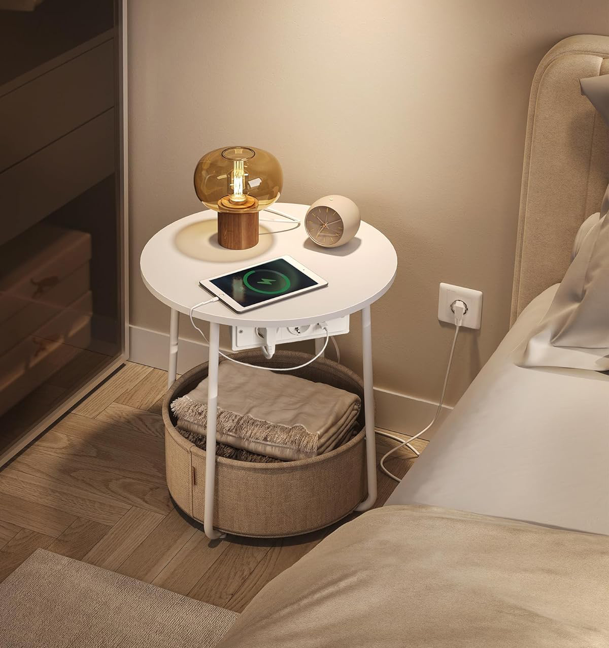 VASAGLE Masuta de cafea rotunda cu cos de stofa, statie de incarcare 2 prize si 2 USB, 45x50cm, alb
