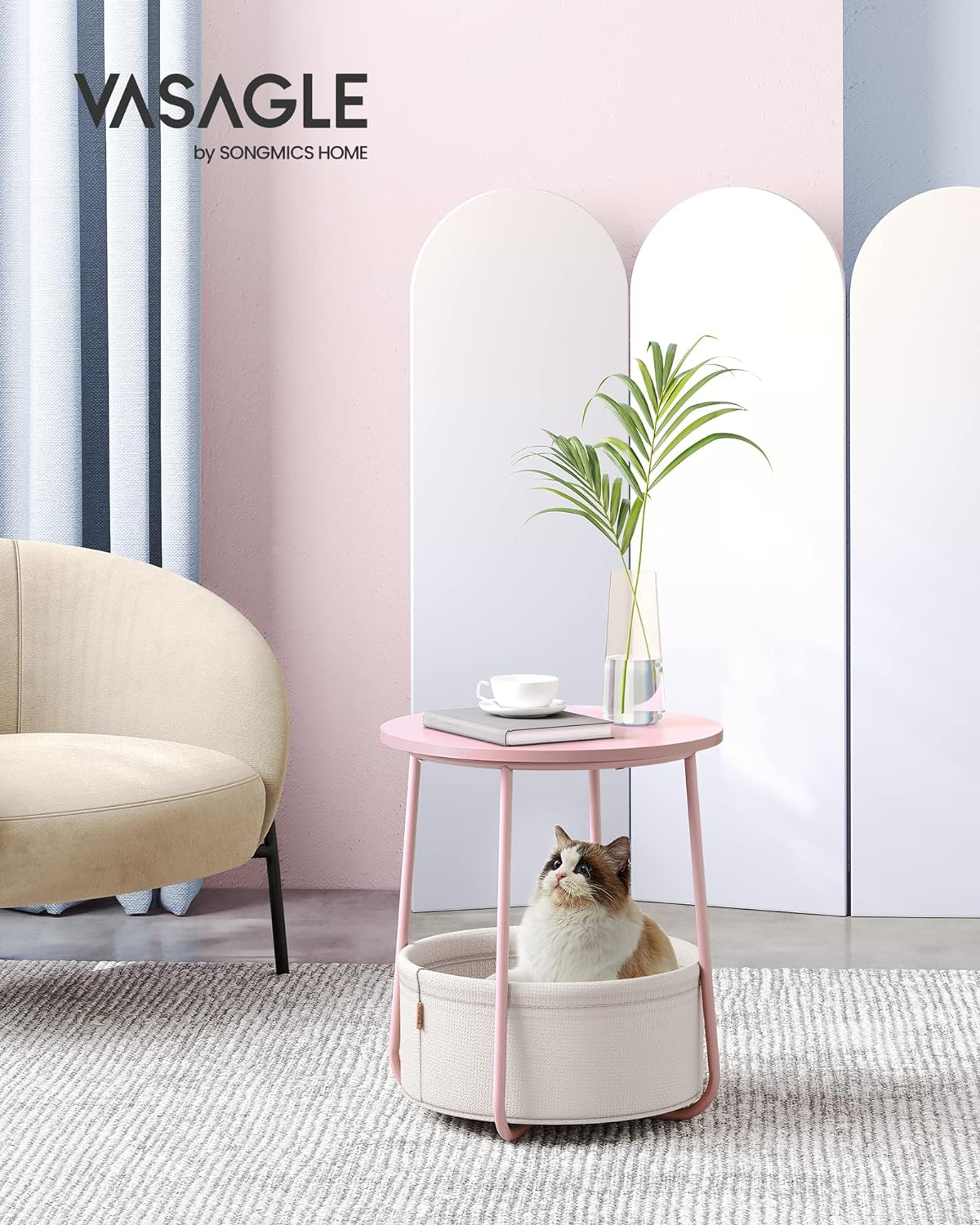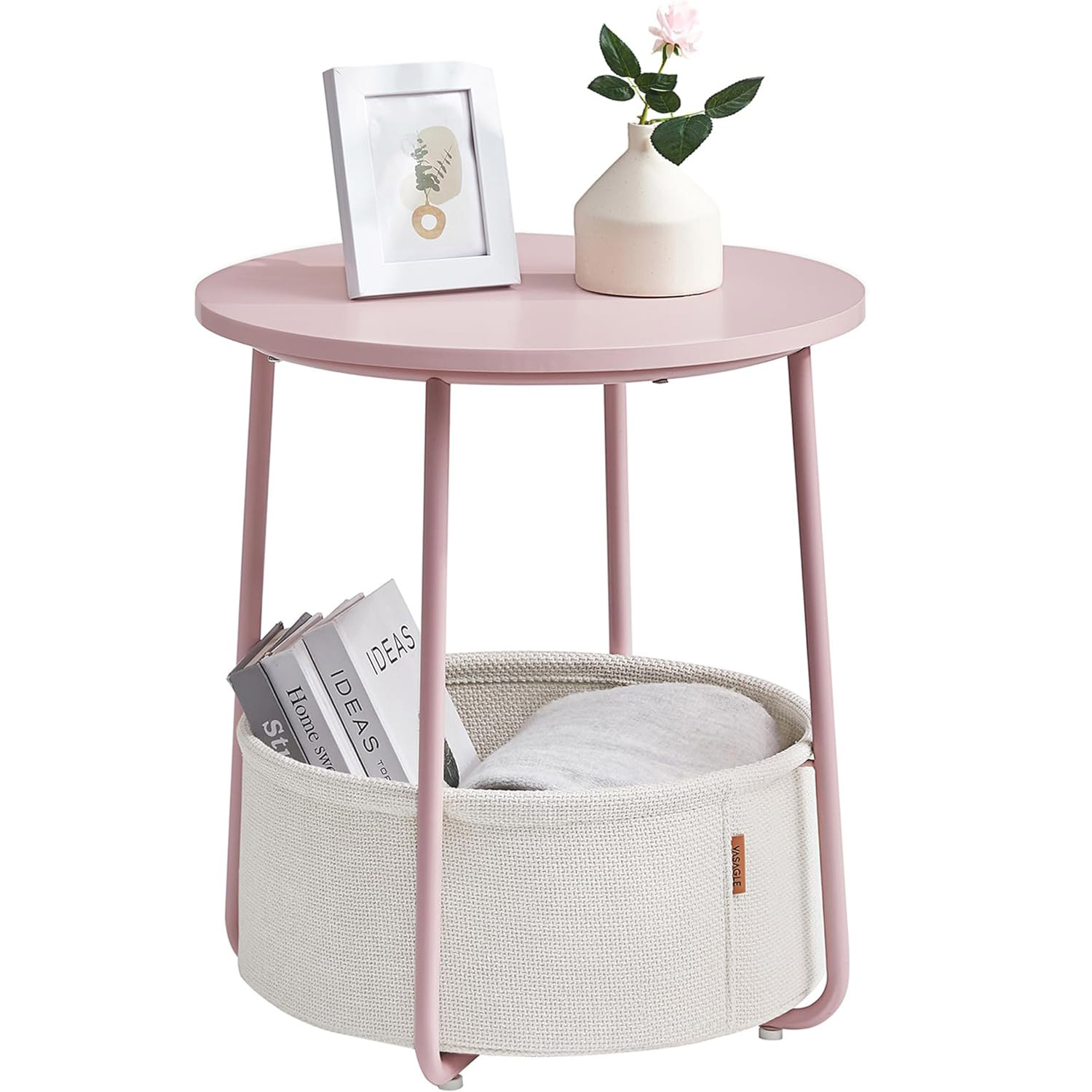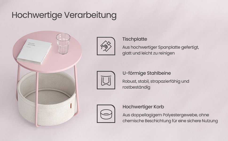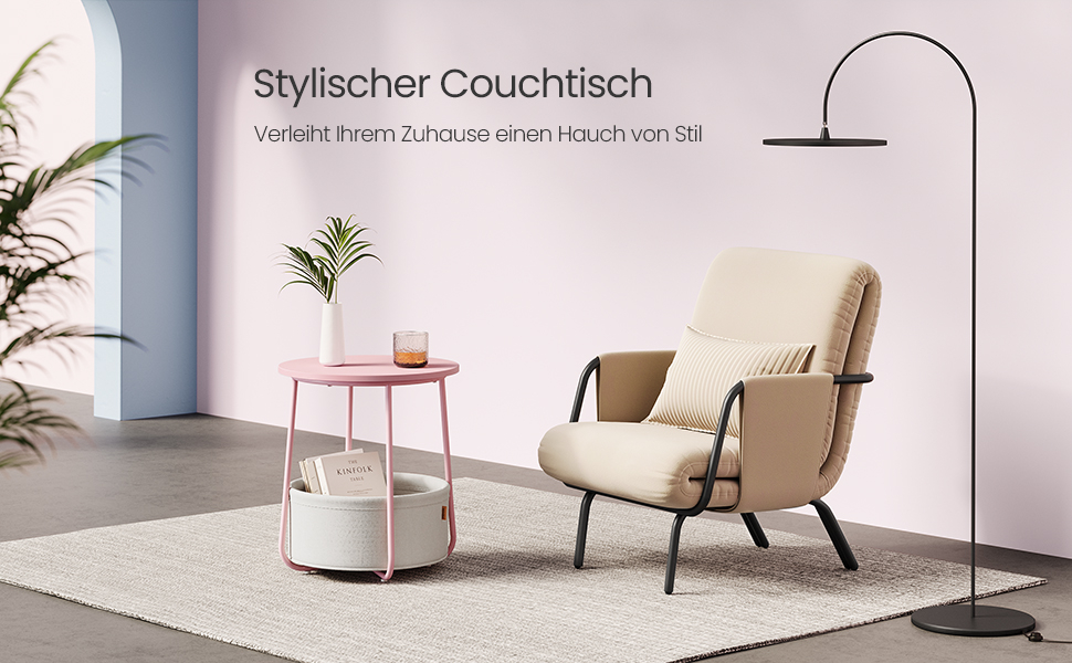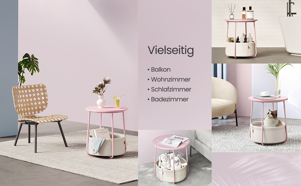 Detalii despre produs: Culoare: roz cu bej Material: Placi aglomerate din lemn, otel, tesatura din poliester. Dimensiunea mesei laterale: 45 x 50 cm (diametru x inaltime). Dimensiunea cosului din tesatura: 39,6 x 18,2 cm (diametru x inaltime). Greutate totala: 4,1 kg. Capacitate de incarcare statica a blatului mesei: 35 kg Despre acest articol Moderna si simpla: aceasta masuta rotunda simpla adauga o nota de stil in camera de zi sau in dormitor datorita combinatiei de roz pastel si alb nor si se potriveste cu diferite stiluri de interior. Potrivita pentru spatii mici: Masuta de 45 x 50 cm (diametru x inaltime) are un cos de 39,6 x 18,2 cm (diametru x inaltime) si este potrivita pentru spatii mici. Ca masuta laterala in camera de zi sau noptiera in dormitor, ocupa putin spatiu si ofera totusi mult spatiu de depozitare. Solida si stabila: Placile aglomerate solide sunt atasate la cadru ferm. Picioarele in U din otel dintr-o singura bucata asigura o fixare puternica. Picioarele reglabile sporesc stabilitatea si va protejeaza podeaua de zgarieturi. Cos de inalta calitate: Cosul este fabricat din tesatura neteda din poliester cu doua straturi. Acesta nu are niciun strat chimic si asigura o utilizare sigura. Datorita aspectului de panza, confera acestei masute o nota unica. Asamblare usoara si rapida: Datorita structurii simple si instructiunilor clare masuta de cafea mica poate fi montata in 5-10 minute.
