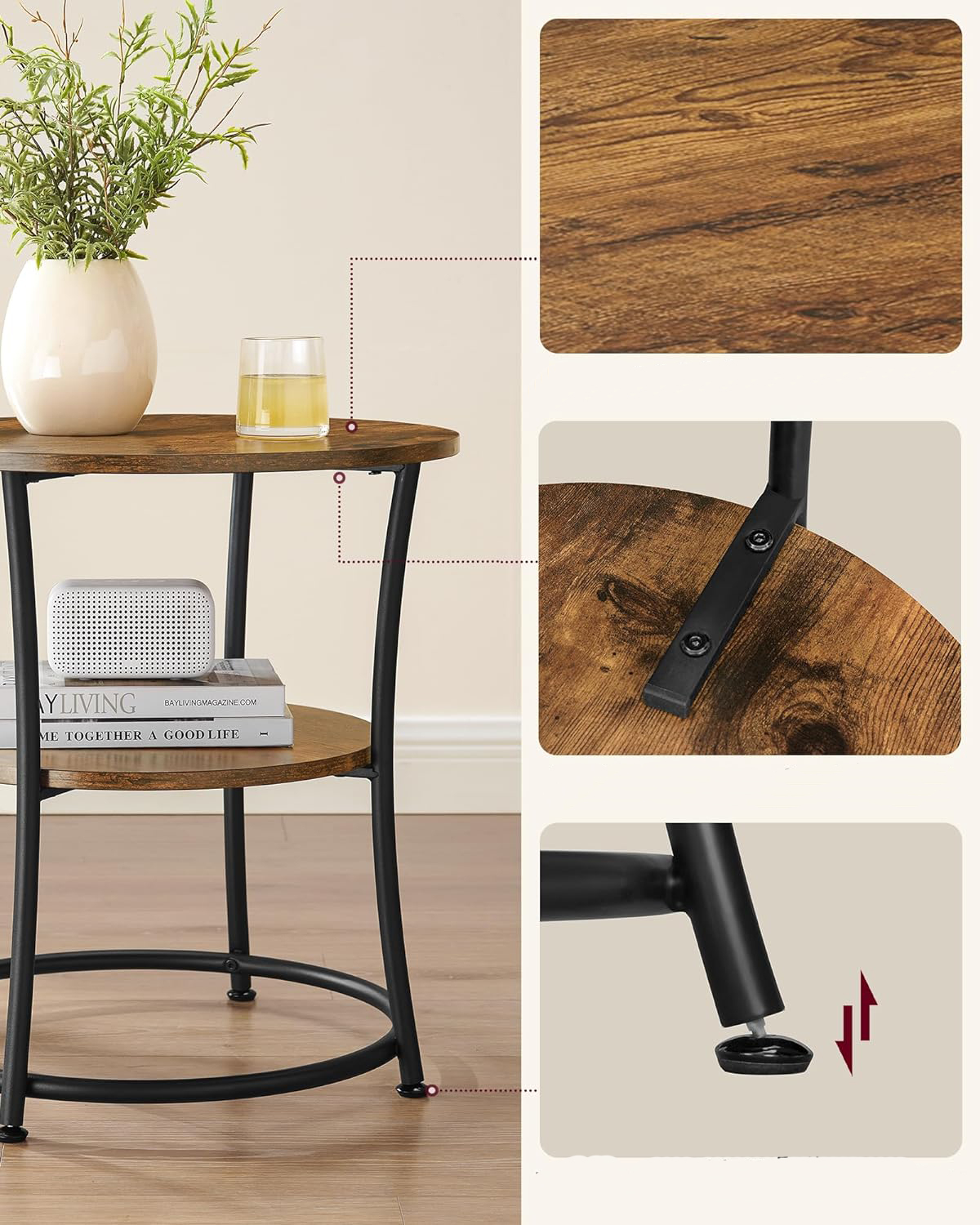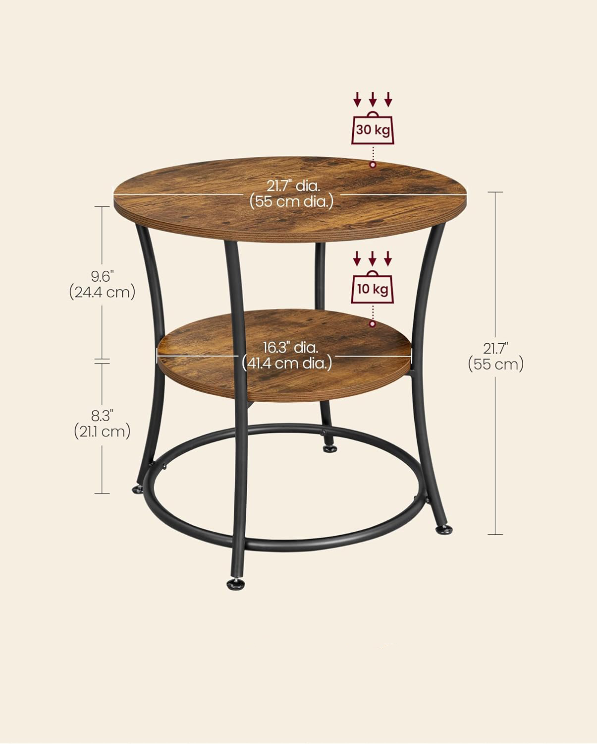 Caracteristici: Culoare: Maro rustic Materiale: Tabla aglomerata, metal Dimensiuni: 55 x 55 cm (Ø x H) Greutate: 6.1 kg Capacitate de incarcare statica max. de la partea superioara a mesei: 30 kg Capacitate max. de incarcare statica de pe raftul de jos: 10 kg Despre acest articol Masa laterala cu diametrul de 55 cm are picioare stabile din otel, care sunt intarite suplimentar de tuburi rotunde. 2 rafturi rotunde, fin lucrate in maro rustic, un cadru din otel negru si numeroase scopuri - in ansamblu, aceasta face o masa laterala simpla si totusi extraordinara de clasa extra.Asamblare in timp record: Au disparut zilele in care petreceai ore intregi aranjand o piesa de mobilier. Datorita structurii simple, numarului gestionabil de piese individuale si instructiunilor usor de urmat, aceasta masa laterala poate fi asamblata in timp record.Se potriveste in orice mod: Ca masuta laterala langa canapea in camera de zi, ca raft suplimentar pe hol sau ca noptiera langa pat - va completeaza spatiul in orice mod.