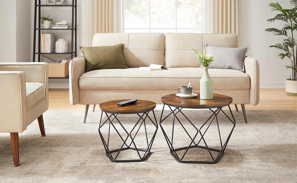 Specificatii: Culoare: maro rustic, negru Material: Placi aglomerate, otel Marimea mesei mari: 50 x 40 cm Dimensiunea mesei mici: 40 x 36 cm Greutate totala: 7 kg Capacitate de incarcare statica a fiecarei mese: 20 kg Despre acest articol Dimensiunea mesei laterale mari este de 50 x 40 cm (diametru x inaltime), iar cea a mesei mici este de 40 x 36 cm (diametru x inaltime), perfecta pentru spatii mici. Ceaiul de dupa-amiaza, decoratiuni sau laptop, totul isi gaseste locul aici.Datorita instructiunilor clare si a pieselor etichetate, puteti asambla acest set in cel mai scurt timp. Nu va faceti griji daca pierdeti un surub, exista piese de schimb in pachetul de accesorii.Combinatia de placi aglomerate din lemn de inalta calitate si constructia solida din otel face ca aceste mese de cafea sa fie foarte stabile, astfel incat nu se vor clatina atunci cand va luati ceasca de cafea de pe masa, iar fiecare masa poate sustine pana la 44 de kilogrameUtilizati cele 2 mese de canapea impreuna pentru o combinatie armonioasa in camera de zi sau separat, una langa canapea si cealalta in dormitor.Acest set de mese moderne va adauga o nota speciala spatiului dvs.