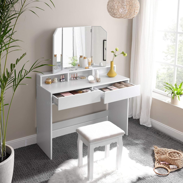 FiltreRedescoperă farmecul ritualului zilnic de îngrijire cu o masă de toaletă modernă, completată de oglindă și sertare spațioase.