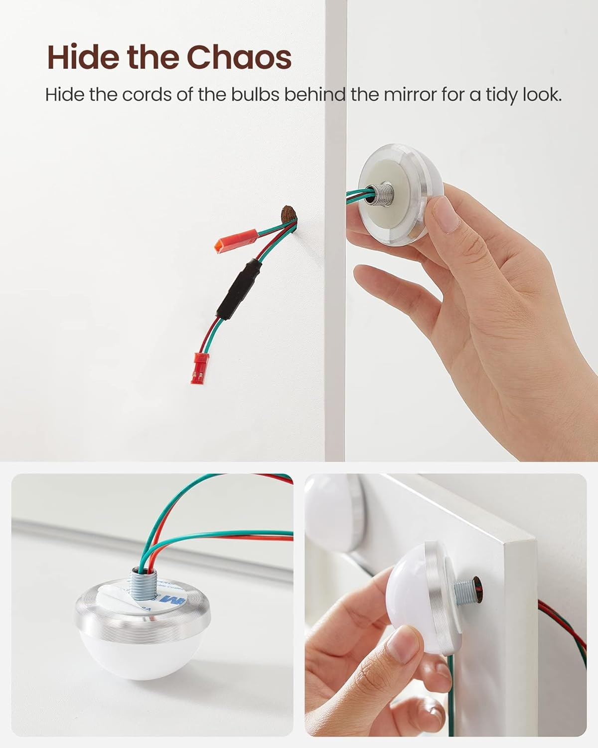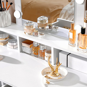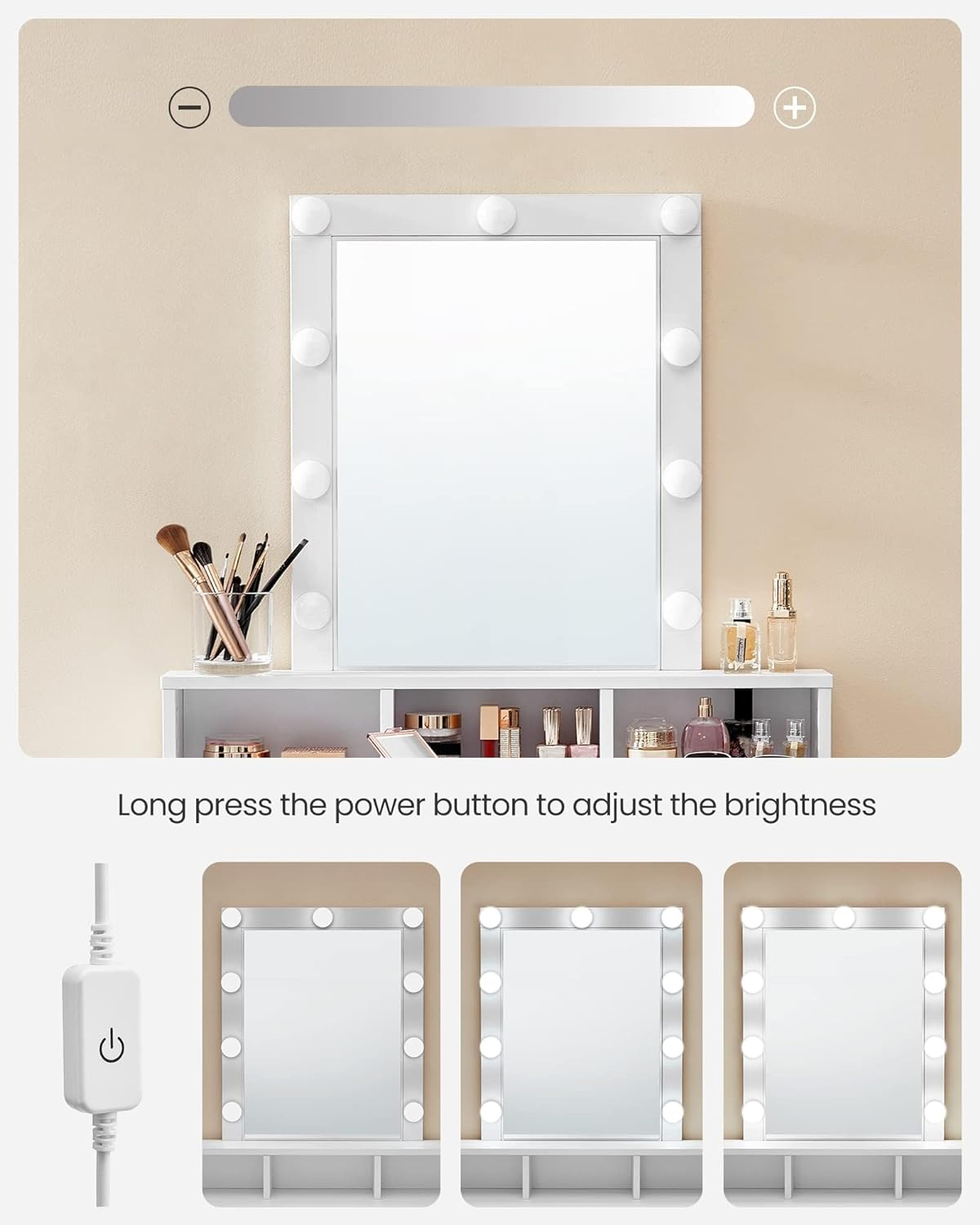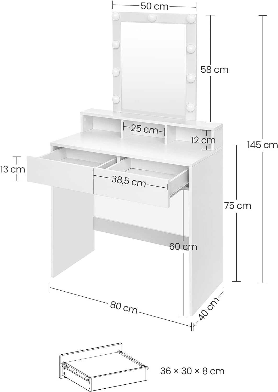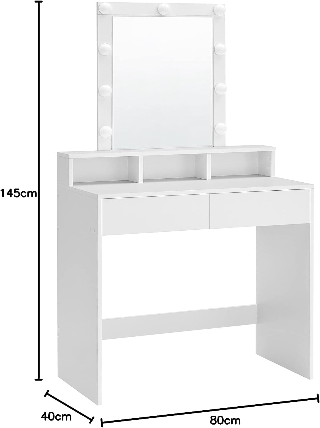 Atentie! Nu sunt incluse taburetul si alte decoratiuni Culoare: alba Dimensiuni: 40 x 80 x 145 cm Dimensiunile produsului: 40D x 80W x 145H cm Marca: VASAGLE Despre acest articol Fara cusur. Spuneti adio machiajului estompat care va strica intregul look. Cele 9 becuri reglabile care inconjoara oglinda iti lumineaza zona de infrumusetare si fac posibil un eyeliner perfect.Totul acolo: Te-ai saturat sa iti cauti machiajul in fiecare zi? Nicio problema. Fardurile de ochi si pudra se afla acum in cele doua sertare mari, lacul de unghii este bine protejat in cele 3 compartimente deschise, iar sticlutele de parfum pot fi asezate pe raftul inaltat.Incepeti ziua cu bucurie: designul modern si culoarea deschisa a acestei masute cosmetice va vor pune mereu un zambet pe fata. Folositi bijuteria pentru a incerca cele mai noi trucuri de machiaj.Intotdeauna in forma: daca dupa ce v-ati aplicat machiajul sunteti socata sa constatati ca exista pete de machiaj pe aceasta masa de toaleta, va putem linisti. Aceasta are un strat de melamina care este usor de curatat.Continut: o masuta de toaleta cu becuri, elemente numerotate si instructiuni usor de urmat (limba engleza nu este garantata). Veti primi, de asemenea, un dispozitiv anti-inclinare si o ocazie excelenta de a va relaxa si de a va pregati.
