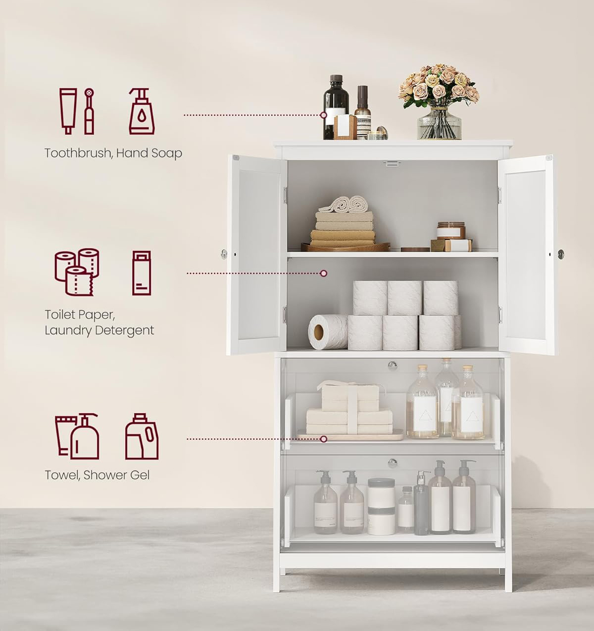 Specificatii: Culoare: Alb Material: MDF (placa de fibre de densitate medie) Dimensiunea produsului: 30 x 60 x 110 cm Max. Capacitate de incarcare statica a partii superioare: 136 kg Despre acest articol Acest mobilier de baie are un dulap superior si 2 sertare spatioase pentru a oferi spatiu amplu pentru uscatorul de par, prosoape, cosmetice, articole de dus si multe altele. Raftul din dulapul superior este reglabil in 5 pozitii, permitandu-va sa depozitati articole de inaltimi diferite.Fabricat din MDF de inalta calitate si echipat cu un dispozitiv anti-inclinare, aceasta unitate de depozitare pentru baie este durabila si stabila. Panourile sale decorative elegante imbunatatesc aspectul baii dvs. Kitul anti-inclinare furnizat va ajuta sa fixati dulapul de baie de perete, creand un mediu de viata sigur. Asamblarea acestui dulap independent este floare la ureche, cu piese etichetate si instructiuni simple.