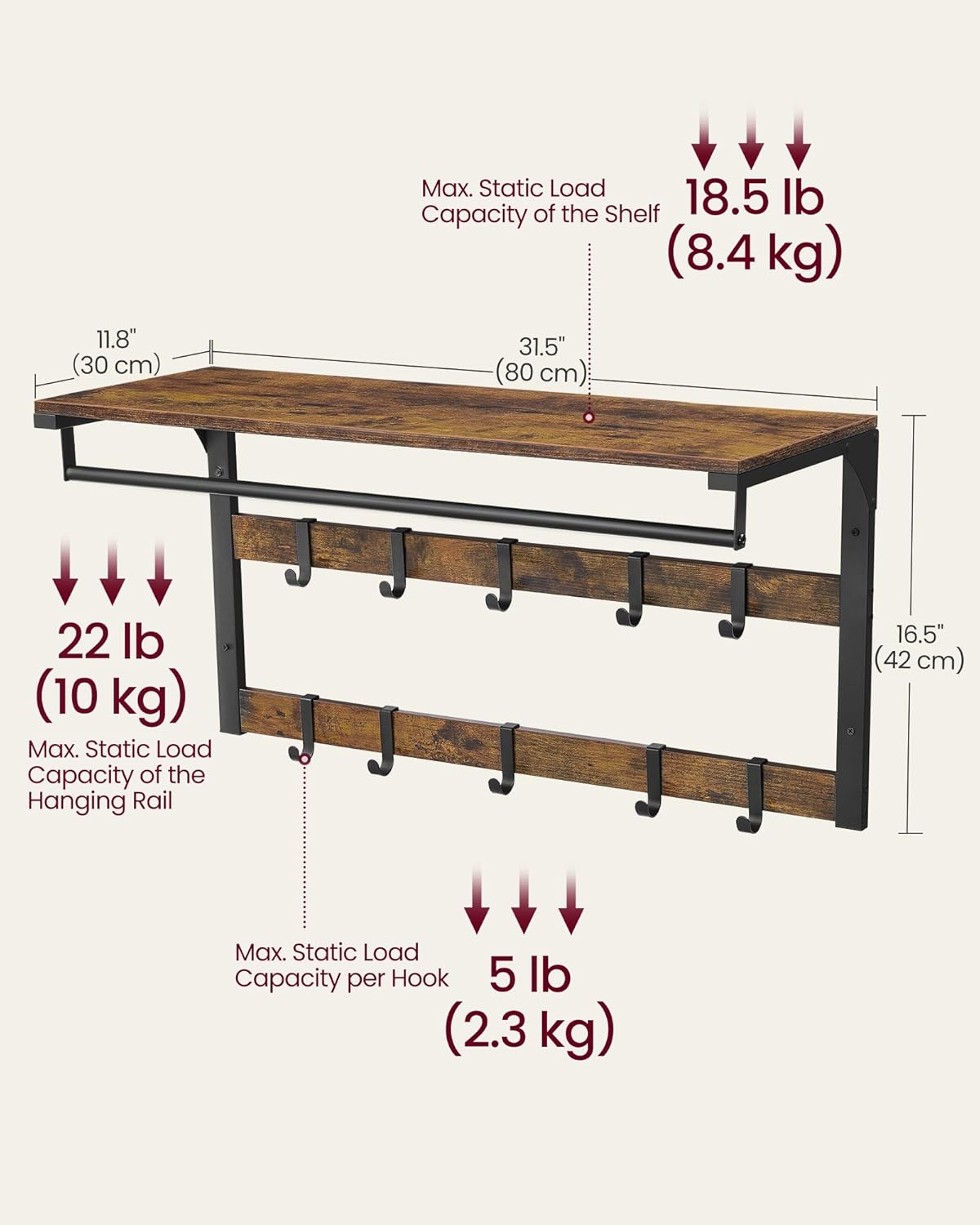Specificatii: Culoare: Maro rustic, NegruMaterial: Placi aglomerate PAL, otelDimensiunea produsului: 30 x 80 x 42 cm (D x W x H)Dimensiunea raftului: 30 x 80 x 1,5 cm (D x W x H)Greutatea produsului: 4,2 kgMax. Capacitatea de incarcare statica a raftului: 8,4 kgMax. Capacitatea de incarcare statica a fiecarui carlig: 2,3 kgMax. Capacitatea de incarcare statica a sinei de agatat: 10 kgTotal Max. Capacitate de incarcare statica: 20,7 kg Continutul pachetului: 1 x Suport pentru haine montat pe perete1 x Kit de accesorii1 x Instructiuni Note VASAGLE: Va rugam sa montati acest articol pe un perete solid. Daca doriti sa il montati pe gips carton, obtineti mai intai suruburile corecte de la un magazin de bricolaj. Design 3 in 1 Cu un raft, carlige detasabile si o sina de agatat, acest cuier de perete va permite sa afisati, sa organizati si sa agatati hainele intr-un singur loc convenabil Carlige detasabile Cele 10 carlige detasabile in 2 randuri de pe acest raft de perete va permit sa reglati distanta dintre ele pentru a agata genti, haine si alte articole de diferite dimensiuni Capacitate mare de incarcare Fabricat din otel si placi aglomerate PAL, carligele pentru haine cu raft pot sustine pana la 20 kg pe raft, 5 kg pe fiecare carlig si 15 kg pe sina de agatat (incarcatura totala maxima: 45 kg) Stil industrial Raftul maro rustic de 30 x 80 x 42 cm nu numai ca ofera mult spatiu, dar adauga si o nota rustica peretelui Usor de asamblat Nici o asamblare dificila aici. Cu instructiuni detaliate si piese clar marcate, veti obtine acest cuier cu raft gata in cel mai scurt timp