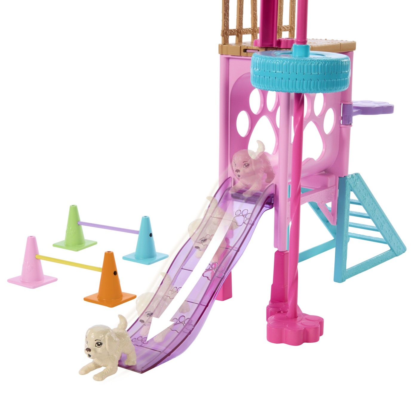 Copiii pot descarca toata energia jucandu-se cu papusa Stacie si acest set de joaca Puppy Obstacle Course. Acest loc de joaca personalizabil are un turn care se invarte, o scara si un tobogan. Conurile se conecteaza la cercuri si bastoane de antrenament pentru sarituri, salturi si acrobatii de echilibrare ale catelusilor. Accesoriile precum jucarii pentru catelusi, dulciuri, un trofeu, un pat pentru animale, un pieptene pentru catelusi si un castron incurajeaza jocul cu povesti.