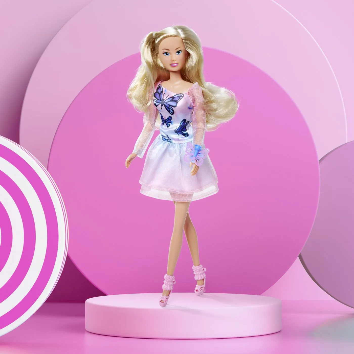 Steffi LOVE intr-un look fluture Steffi poarta o rochie roz si albastra cu un frumos model cu fluturi. Detaliile fluture albastre adauga un farmec aparte tinutei sale. Setul include o bratara asortata cu brosa fluture, completand perfect look-ul lui Steffi si inspirand idei de joaca si mai creative. Cu o inaltime de 29 cm, Steffi este companionul ideal pentru jocuri de rol imaginative si aventuri la moda. Acest set este perfect pentru copiii care iubesc moda si stilul.