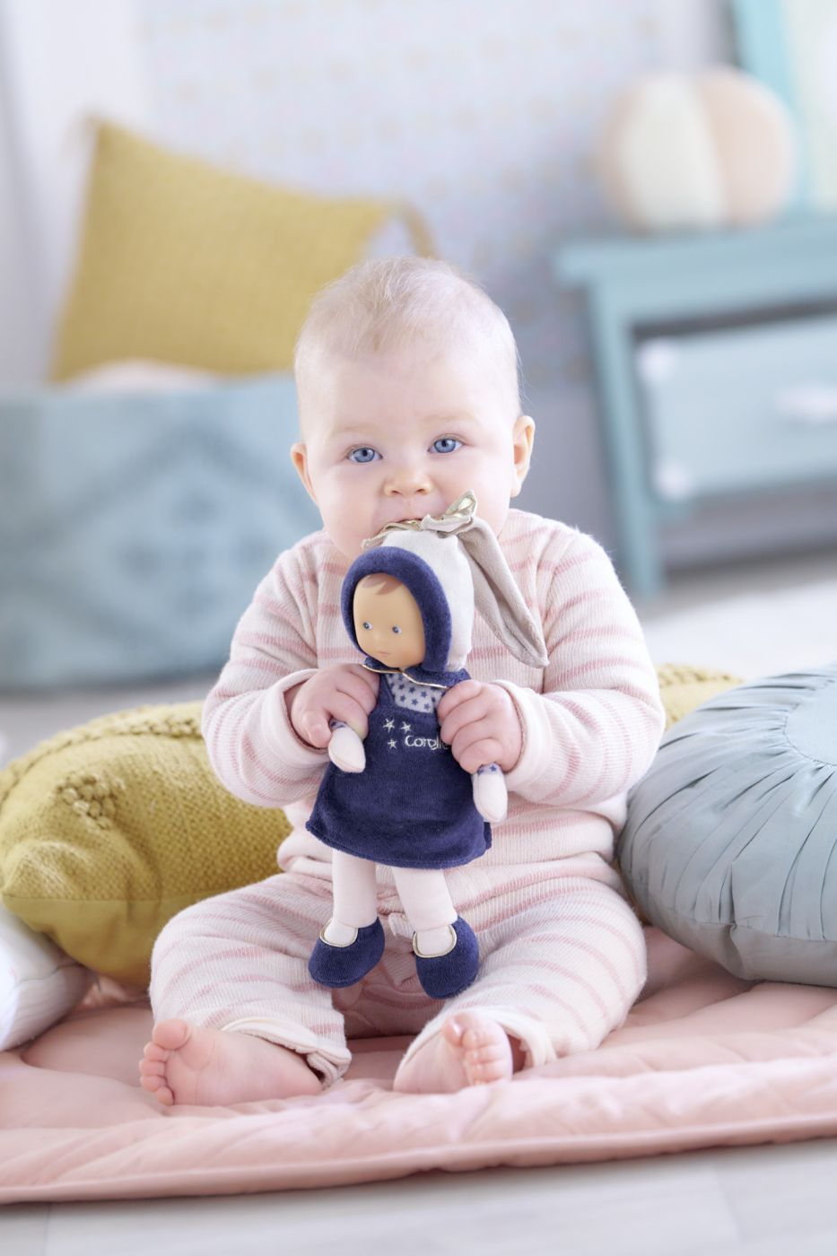 Papusa cu corp moale este fabricata dintr-un material foarte moale si are picioare atarnate. Datorita greutatii sale reduse, papusa este usor de transport de catre copii si perfecta pentru a fi imbratisata si iubita. Papusa dragalasa Miss Blue Star Dreams ii insoteste chiar si pe cei mai mici copii ca o prietena reconfortanta, cu zambetul ei primitor si dimensiunea sa confortabila de 25 cm. Papusa poate fi spalata la masina la ciclu delicat. De asemenea, in interior este cusuta o eticheta pentru introducerea numelui si adresei in caz de pierdere. Toate papusile Corolle au un parfum placut si delicat de vanilie. Acest lucru creeaza o atmosfera confortabila si este calmanta.
