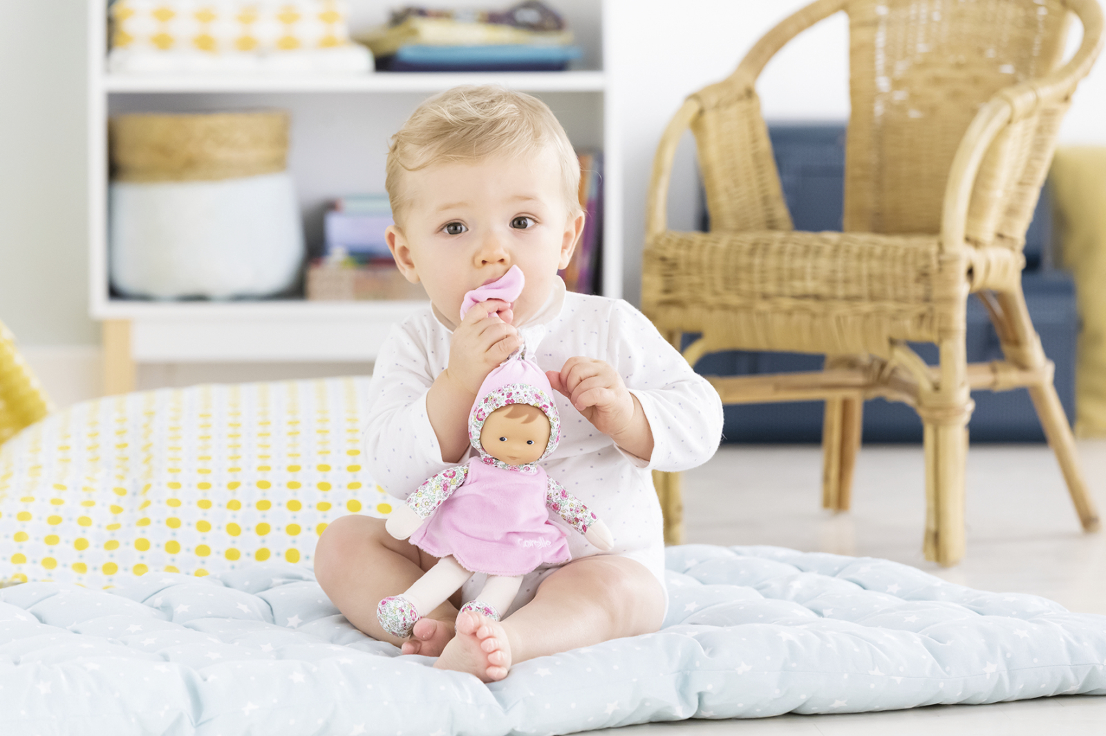 Papusa cu corp moale este perfecta pentru cei foarte mici. Are dimensiunea perfecta , 25 cm, pentru ca mainile mici sa o apuce si sa o tina de sapca, palarie, brate, picioare, chiar si rochia ei si este confectionata dintr-o tesatura ultra-moale care o face foarte dragalasa. Fata ei dulce si realista de vinil farmeca si mangaie copilul si este delicat parfumat cu vanilie. Un plus pentru parinti papusa moale Miss Pink Blossom are o eticheta cusuta pentru a scrie prenumele bebelusului sau un numar de telefon in cazul in care papusa este pierduta.
