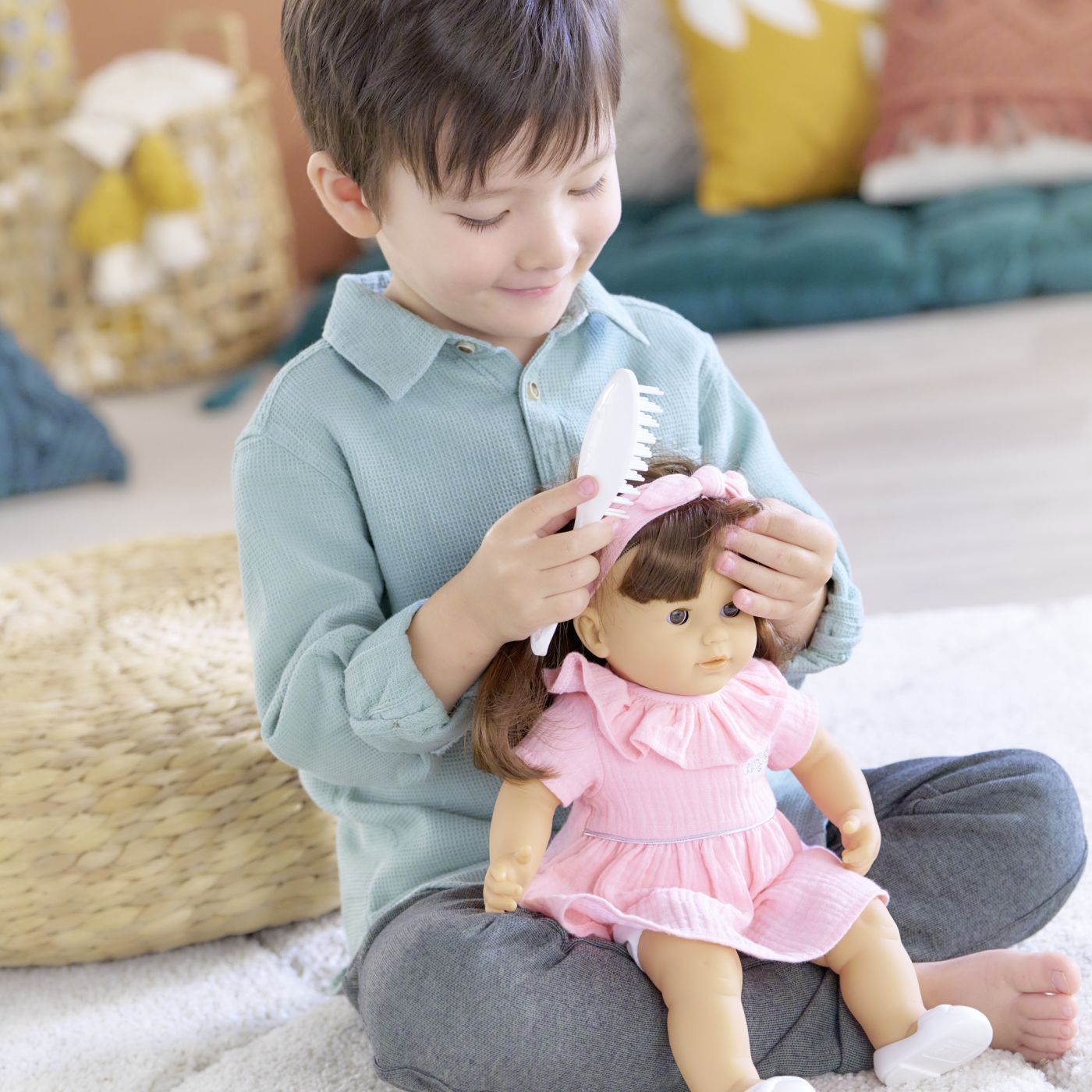Julie este o papusa bebelus Corolle mare, pentru joaca si pentru a se comporta ca adultii. Masoara 36 cm, o dimensiune perfect potrivita bratelor mici ale unui copil pentru a fi alintat, ingrijit si pentru a reproduce actiunile care fac din maturizare o realitate. O papusa bebelus mare, cu pielea alba fata, bratele si picioarele, cu un parfum delicat de vanilie, sunt fabricate din vinil moale la atingere. Corpul ei este flexibil pentru o miscare usoara si poate sta in sezut. Degetul mare poate fi tinut in gura. Cu ochii ei albastri somnorosi, doarme cand sta intinsa pe spate. Este imbracata intr-o frumoasa salopeta roz si o camasa alba cu maneci lungi, cu model si guler Peter Pan. Pentru a-si completa tinuta, Julie poarta o bentita asortata si o pereche de balerini albi. Julie are o colectie completa de haine si accesorii Mon Grand Poupon Corolle pentru a imita actiuni de zi cu zi si a inventa scenarii de jocuri multiple si variate. Potrivita pentru varste de la 2 ani in sus.