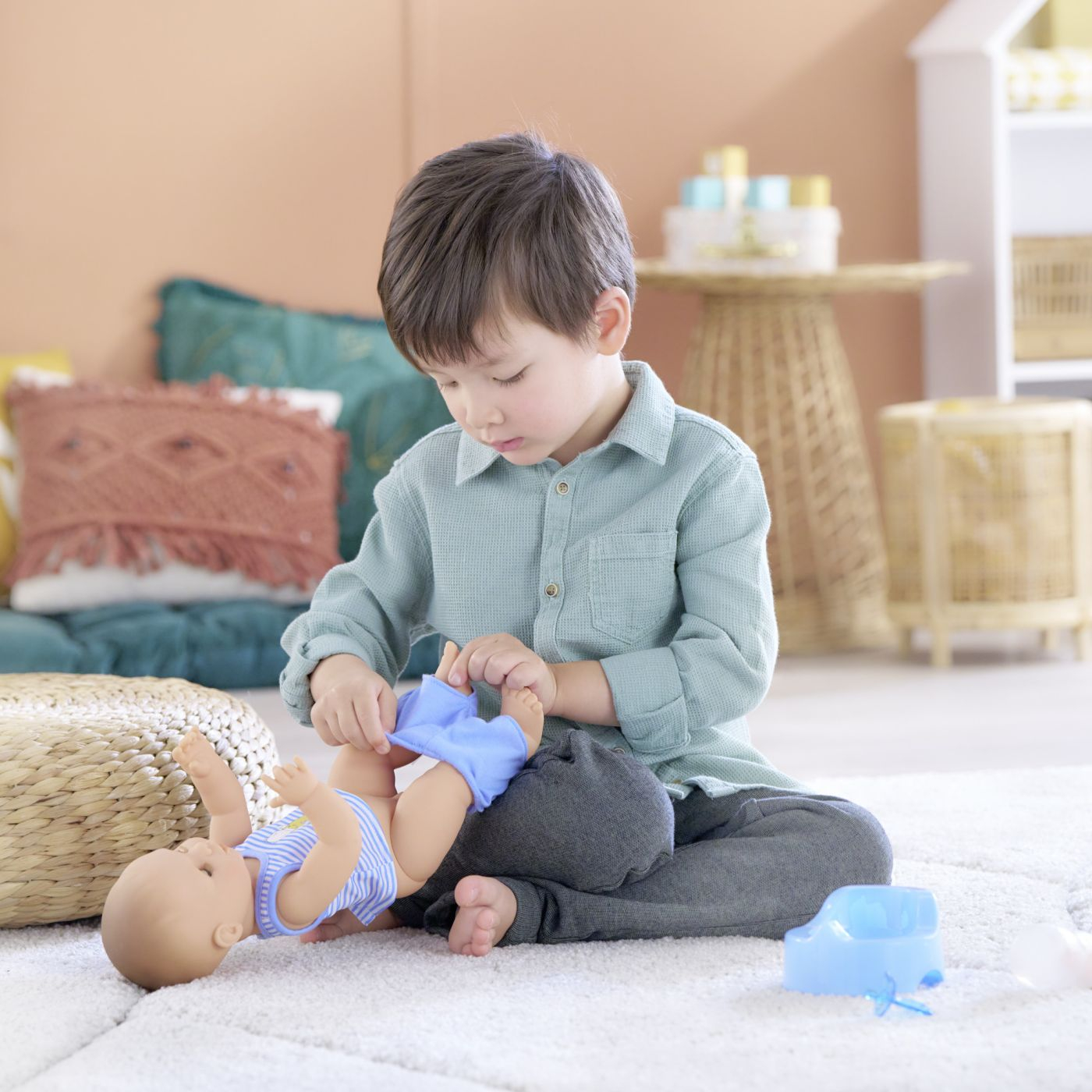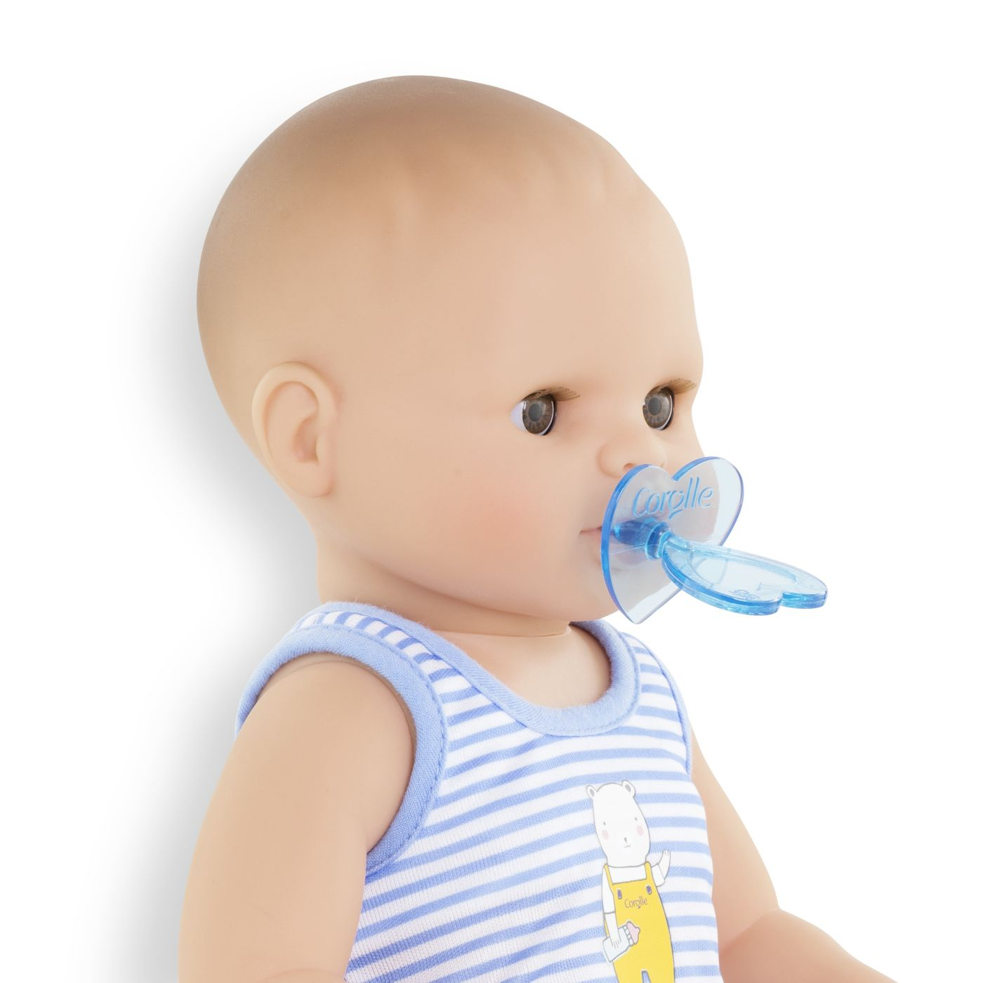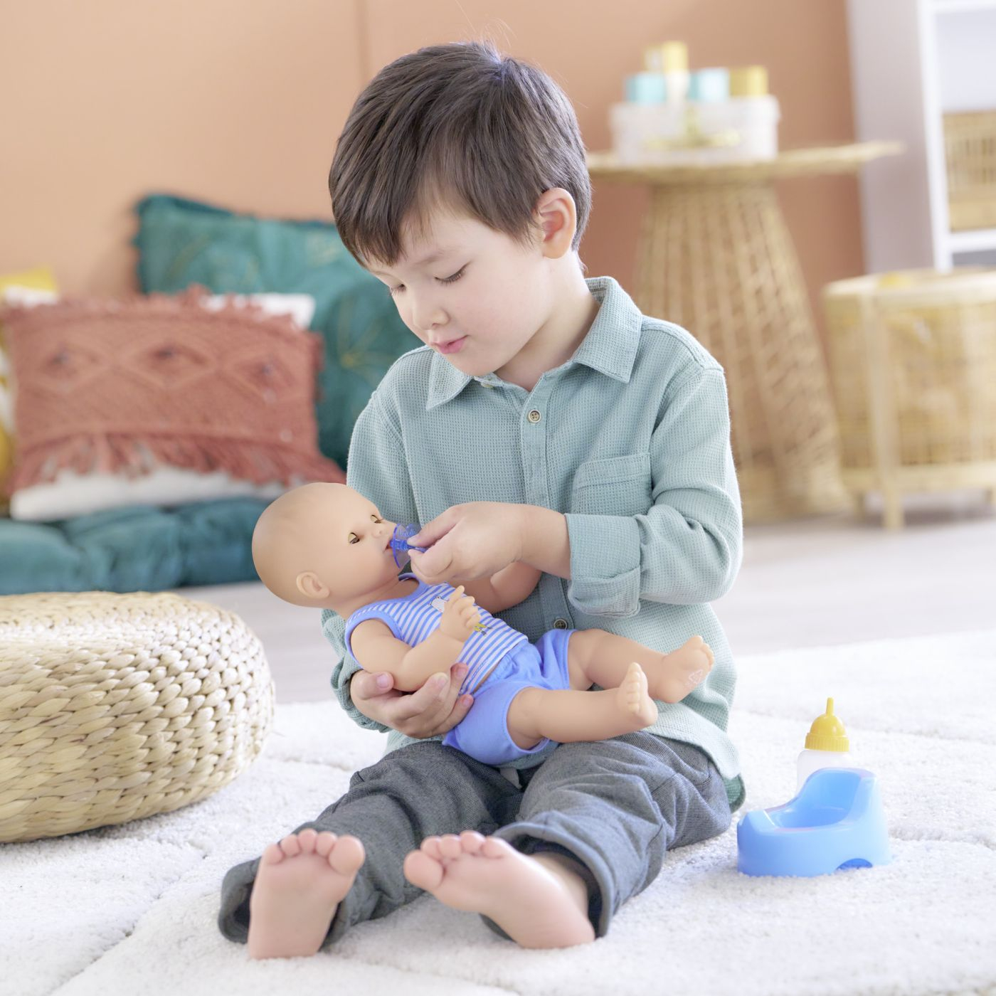 Paul este o papusa mare Corolle pentru joaca si comportament ca adultii. Cu olita ei, biberonul de umplut si suzeta, este companionul perfect pentru antrenamentul la olita! Datorita corpului ei, delicat parfumat cu vanilie si fabricat in intregime din vinil moale la atingere, poate intra in apa in timp ce sta in sezut. Masoara 36 cm, o dimensiune perfect potrivita pentru bratele mici ale unui copil pentru a fi alintat, a fi mama si a imita actiunile care definesc cresterea unui copil. Cu ochii ei somnorosi, adoarme cand sta intinsa pe spate. Este imbracata in pantaloni scurti frumosi cu imprimeu floral si un maiou. Degetul mare poate fi tinut in gura. Paul are o colectie completa de haine si accesorii Corolle mon grand poupon pentru a imita gesturile de zi cu zi si a inventa scenarii de joaca multiple si variate. Nu poate purta ghete. De la 2 ani.