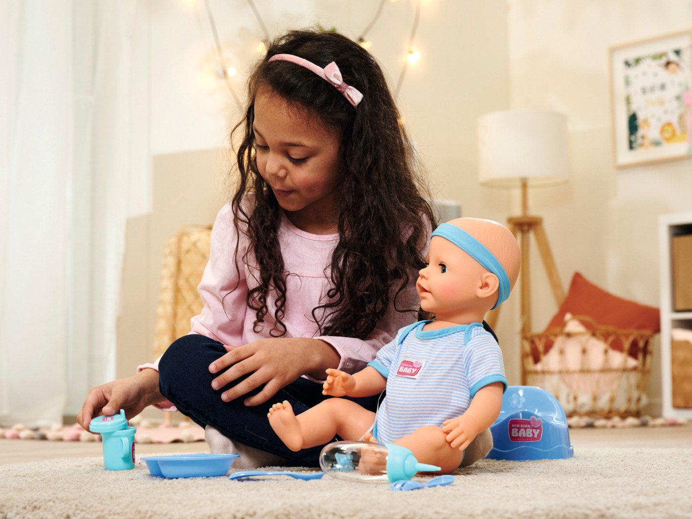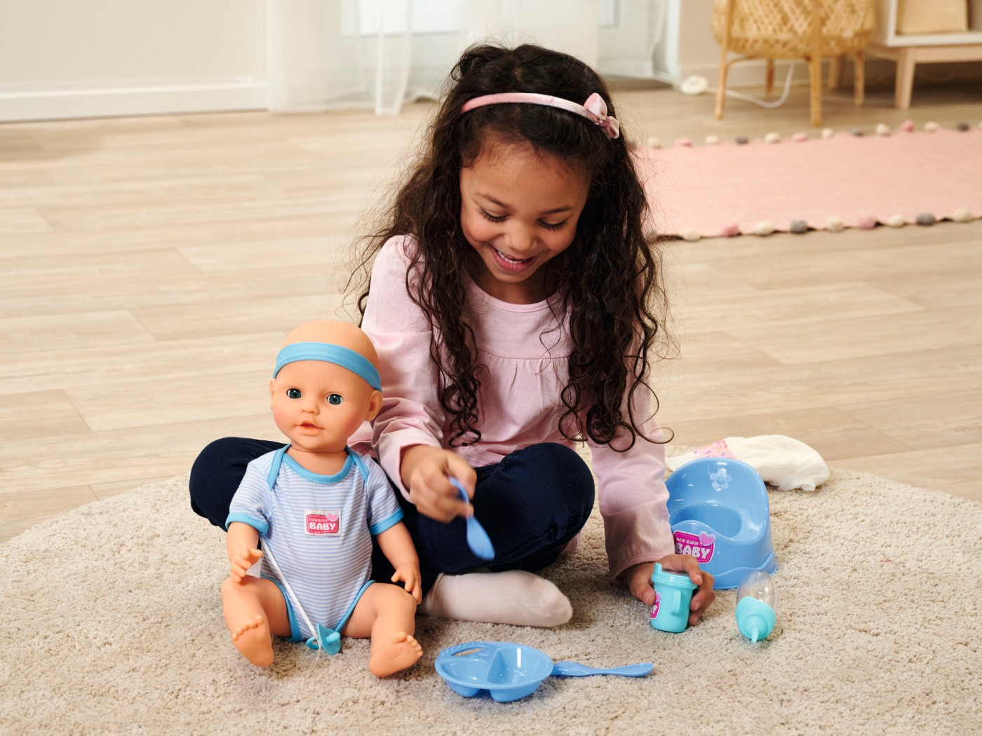 Papusa este imbracata in salopeta, are o banderola cu o fundita. Papusa poate bea si face pipi pe olita. Setul include tot ce este necesar pentru ingrijirea papusii. Poti s-o hranesti, sa-i dai o suzeta, sa-i schimbi scutecul si s-o pui pe olita