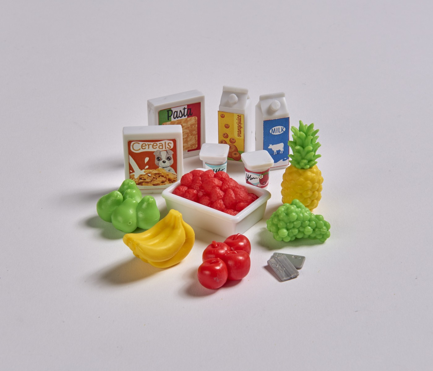 Steffi este la cumparaturi in supermarket., Setul include multe alimente, fructe , legume, casa de marcat, cosulet de cumparaturi si punga.Papusa este imbracata intr-o rochita roz cu imprimeu de ananasi. Inaltime papusa 29 cm.