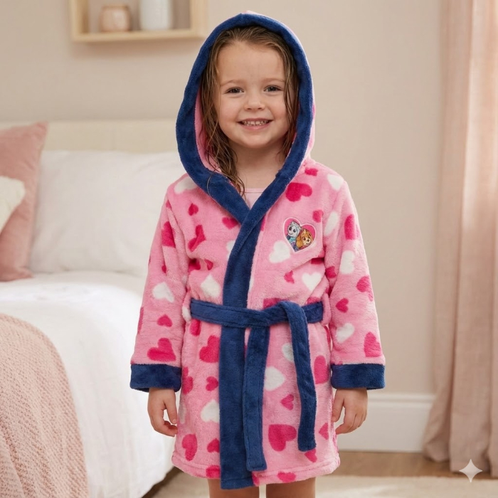 Halat de baie pentru copii cu design oficial Patrula Cățelușilor Skye & Everest, creat special pentru micile fane ale îndrăgitelor personaje. Modelul este prevăzut cu glugă confortabilă, cordon reglabil în talie și este decorat cu un imprimeu vesel cu inimioare, completat de emblemă cu Skye și Everest. Textura moale și croiala lejeră îl fac ideal pentru momentele de relaxare după baie, dimineața sau înainte de culcare.