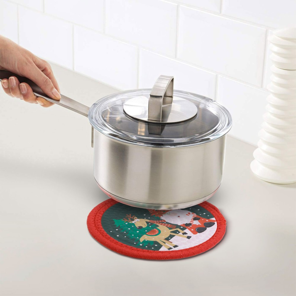 Covoraș de masă de Crăciun din material textil, care împiedică deteriorarea mesei și blatului dumneavoastră de vasele fierbinți. Acesta se potrivește în decorul mesei festive, astfel încât armonia poate fi completă.