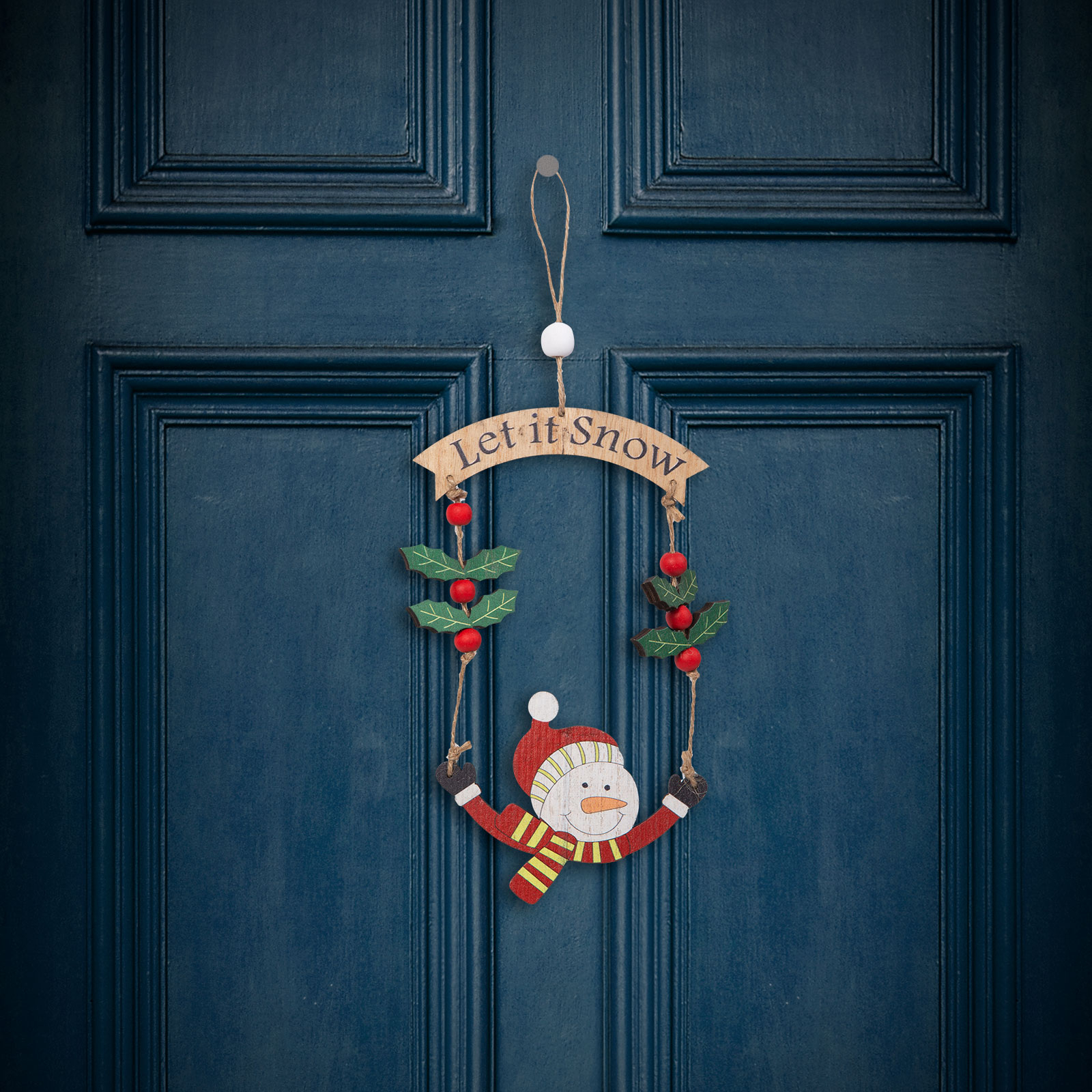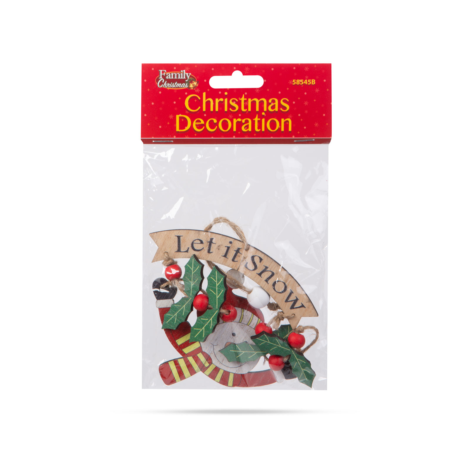 Această frumoasă figurină din lemn poate fi un plus perfect pentru decorațiile de Crăciun din casa ta. Frumos lucrată, decorată cu fructe de pădure și etichetă Let it snow pentru a evoca bucuria și distracția sărbătorilor. Ornamentele din lemn conferă căldură și naturalețe oricărei decorațiuni festive. Pictura elaborată și detaliată asigură un aspect meticulos și atrăgător. Pictată pe o bucată de lemn puternică, dar ușoară, care poate fi agățată oriunde în casa ta.