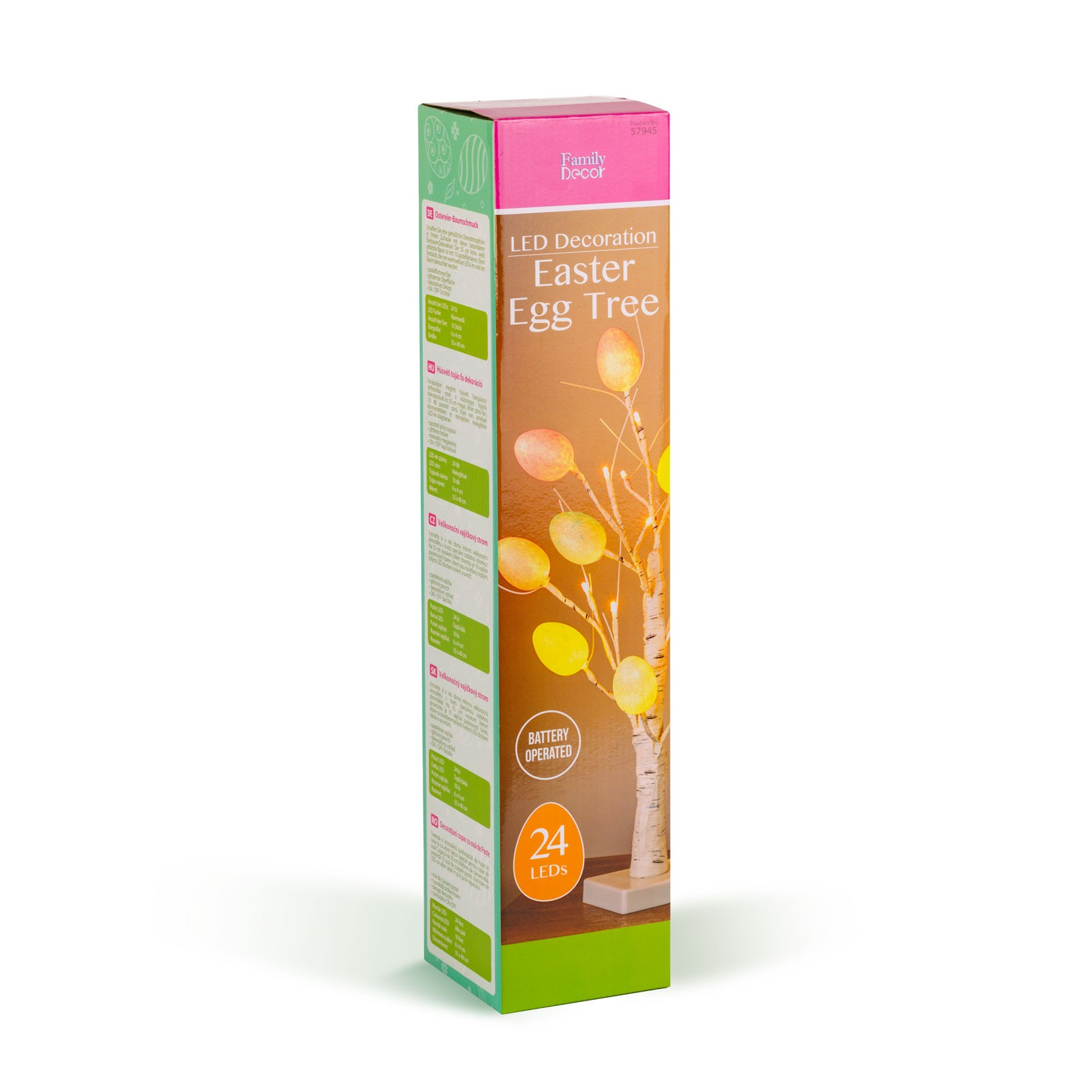 Creează o atmosferă confortabilă de Paște în casa ta cu acest decor special pentru copac de ouă! Copacul de 55 cm înălțime, de culoare albă, are 10 ouă de culoare pastel, iluminate de LED-uri albe calde în și în jurul copacului. Suprafața colorată a ouălor este strălucitoare, creând o atmosferă minunată atunci când lumina strălucește asupra lor. Cu 24 de LED-uri in total, decorul functioneaza cu 3 baterii AA, astfel incat poate fi amplasat cu usurinta oriunde: pe o masa, raft sau chiar pe un pervaz.