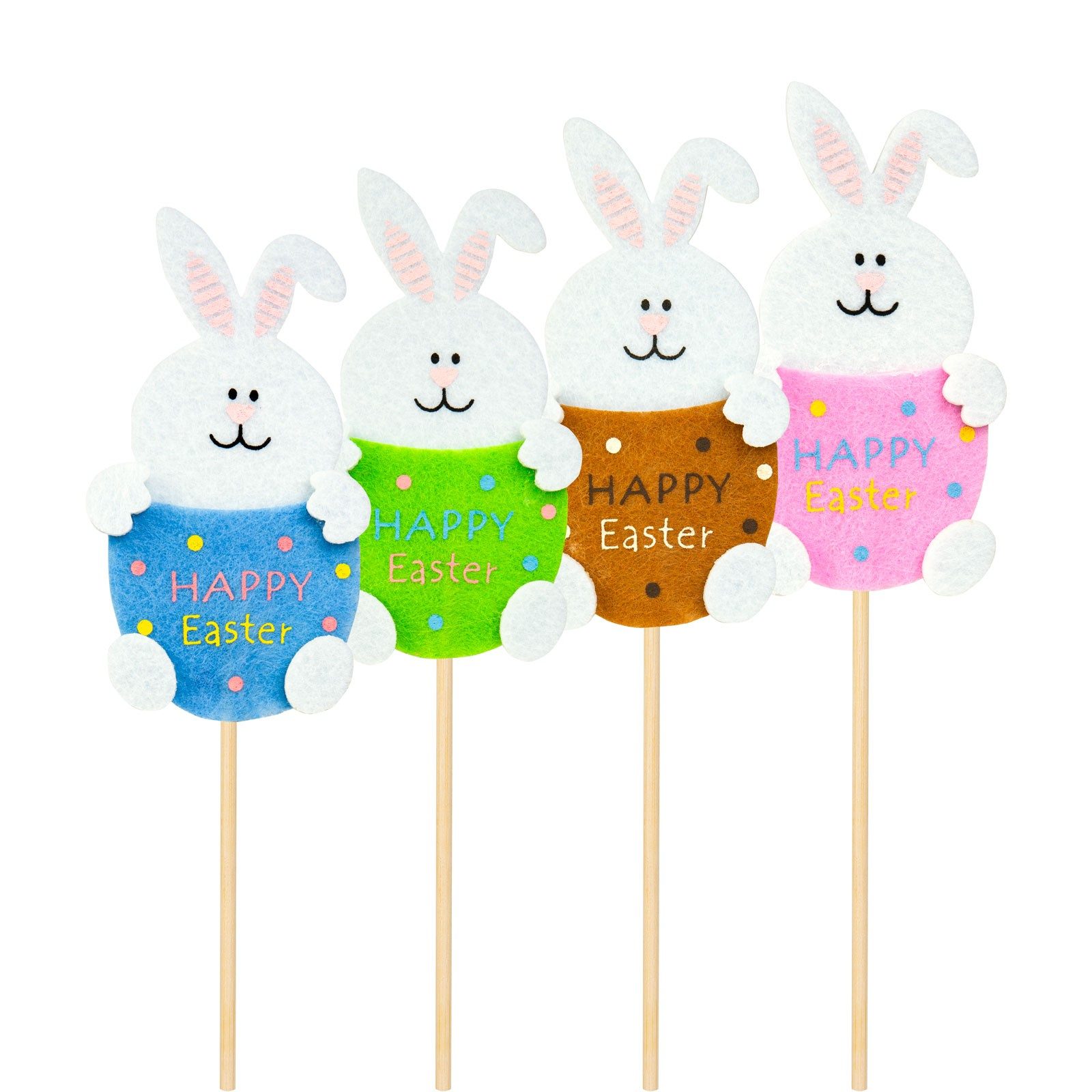 Iepurași de Paște veseli care pot fi infipți în ghivece de flori de plante de interior sau chiar în grădini mici și paturi de flori. Iepurașii, așezați pe bețe de lemn, sunt din lemn. Ideal pentru decorarea oricărei case sau grădini mici pe măsură ce se apropie Paștele.
