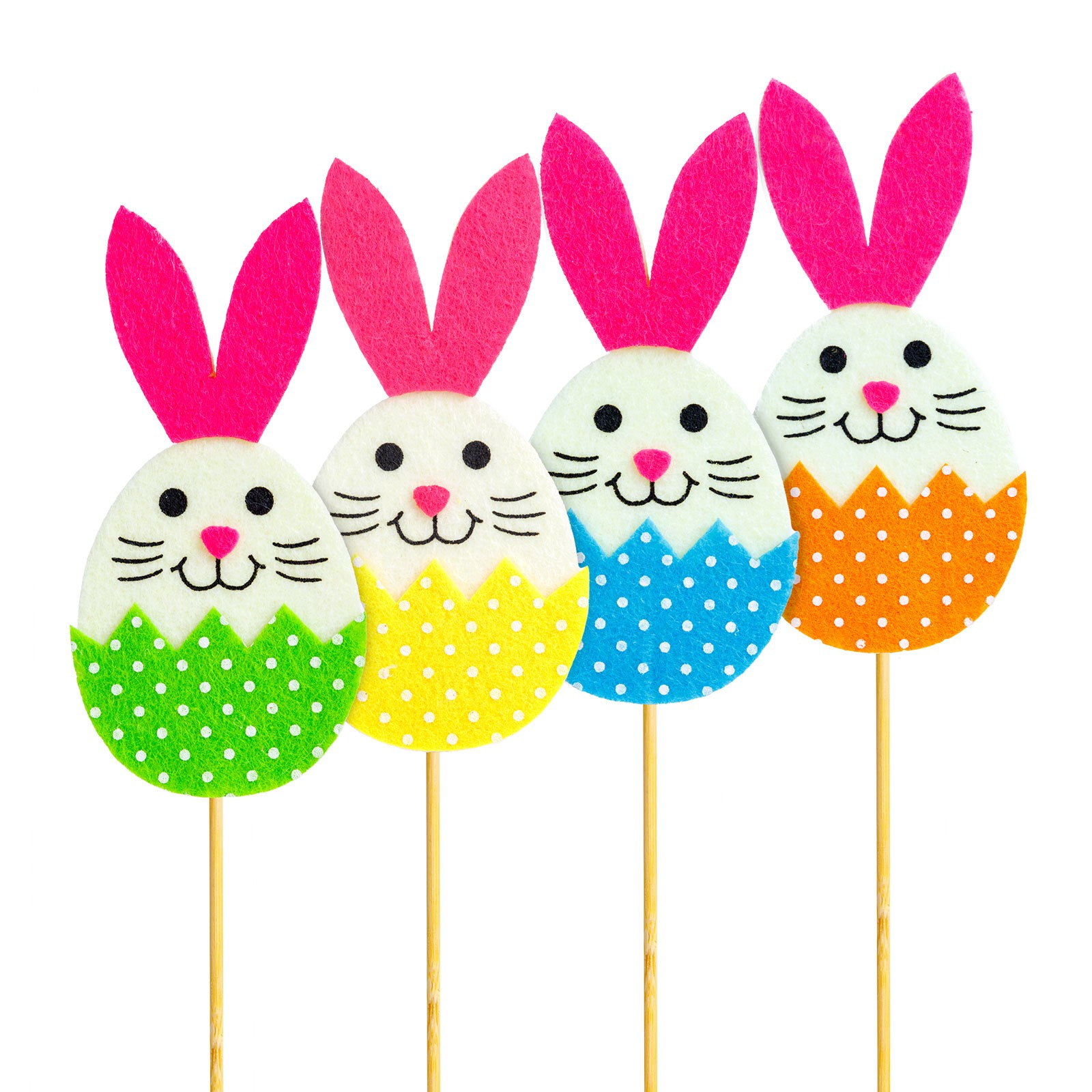 Iepurași veseli de Paște care pot fi înfipți în ghivece de flori de plante de interior sau chiar în grădini mici și paturi de flori. Iepurașii așezați pe bețe de lemn sunt din lemn. Ideal pentru decorarea oricărei case sau grădini mici pe măsură ce se apropie Paștele.
