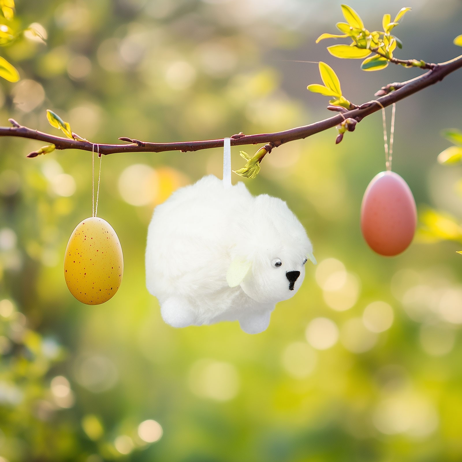 Faceți-vă casa și mai confortabilă cu această adorabilă figurină albă de miel! Decorul moale și pufos este o alegere perfectă ca ornament de masă de Paște, decor pentru raft sau chiar pentru agățat. Datorită buclei de panglică, poate fi amplasată cu ușurință și va aduce o notă festivă oricărei încăperi.
