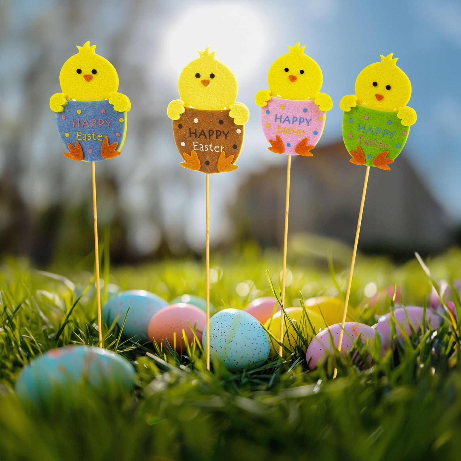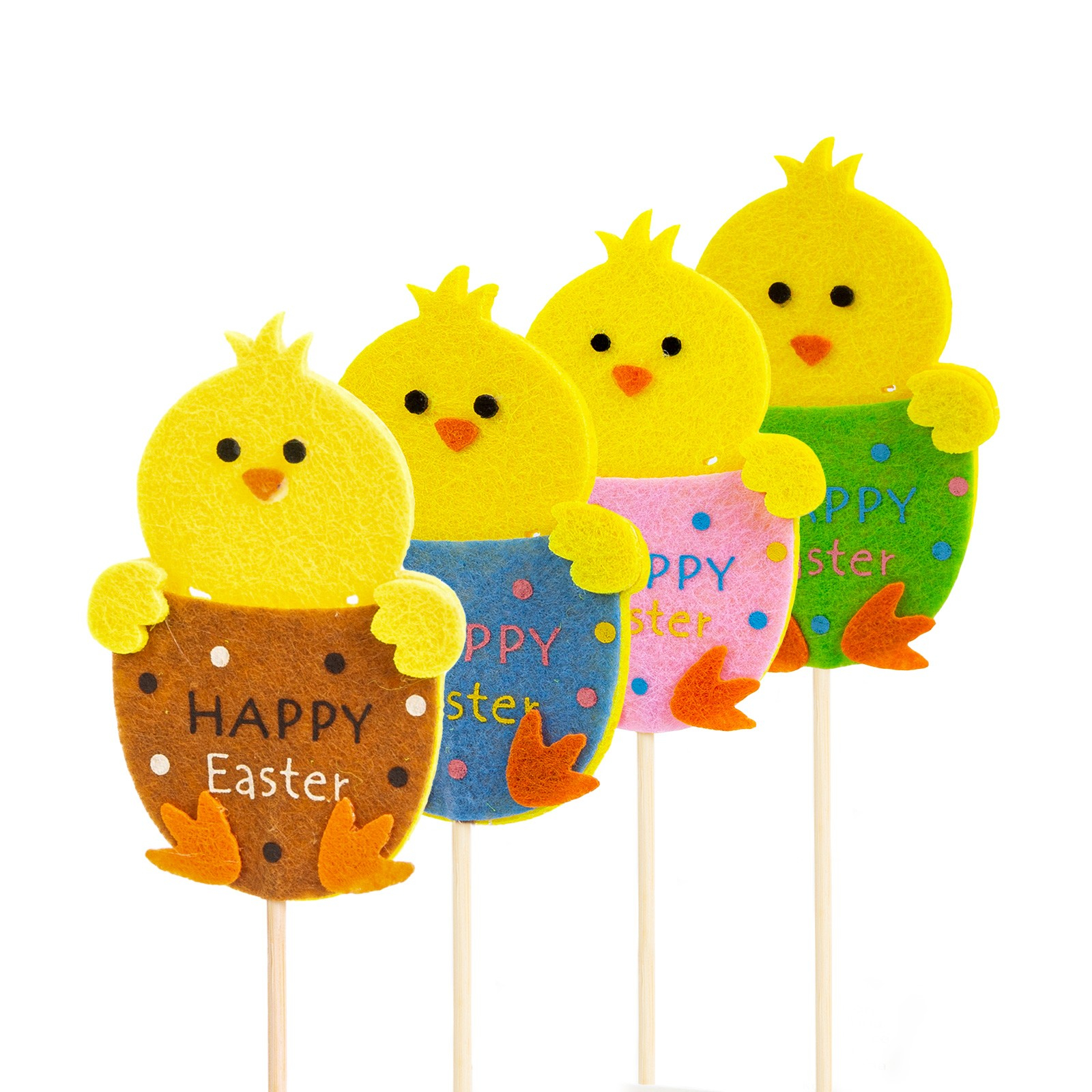 Pui veseli de Paște care pot fi înfipți în ghivece de plante de interior sau chiar în grădini mici și paturi de flori. Puii așezați pe bețe de lemn sunt din lemn. Ideal pentru decorarea oricărei case sau grădini mici pe măsură ce se apropie Paștele.
