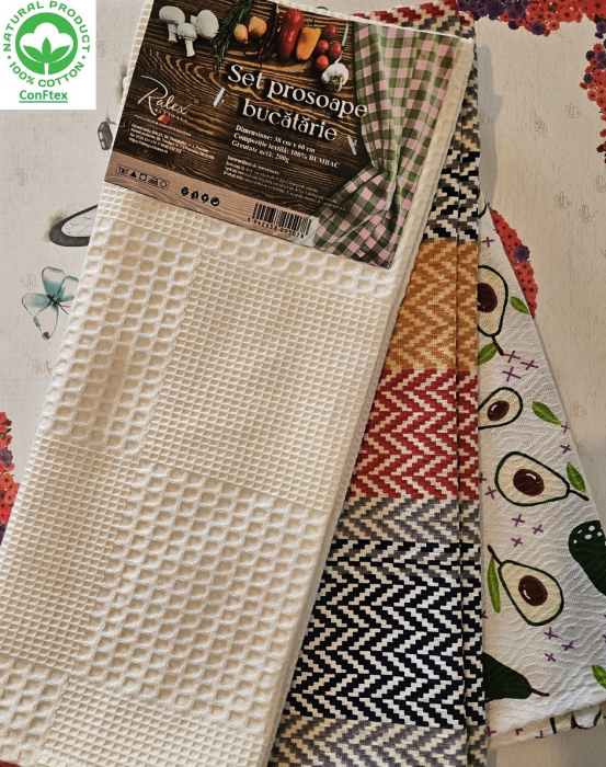 Având în compoziție exclusiv fibre de bumbac au cele mai apreciate caracteristici căutate la textilele de bucătărie: rezistență, durabilitate, textură moale și absorbantă.