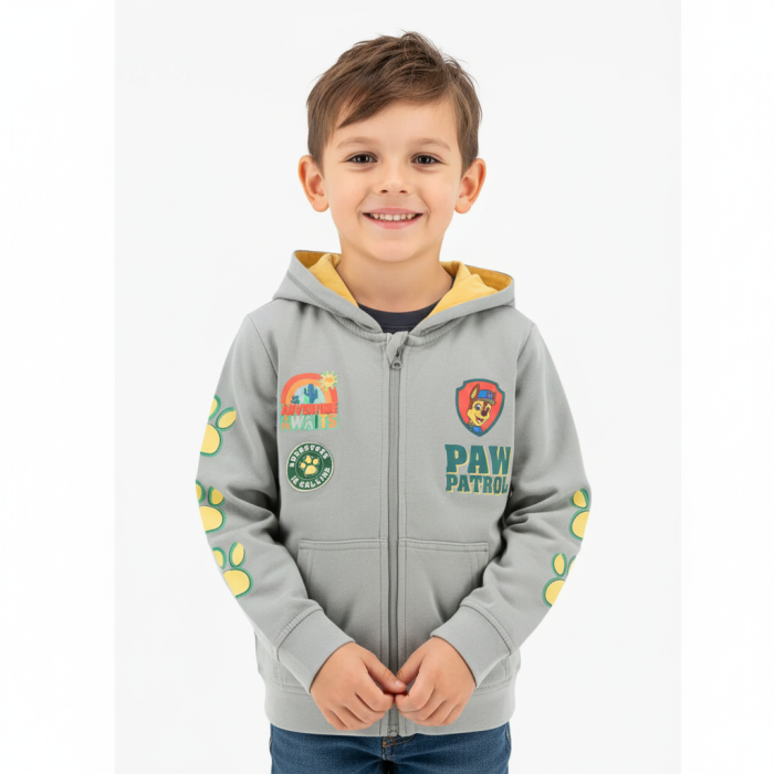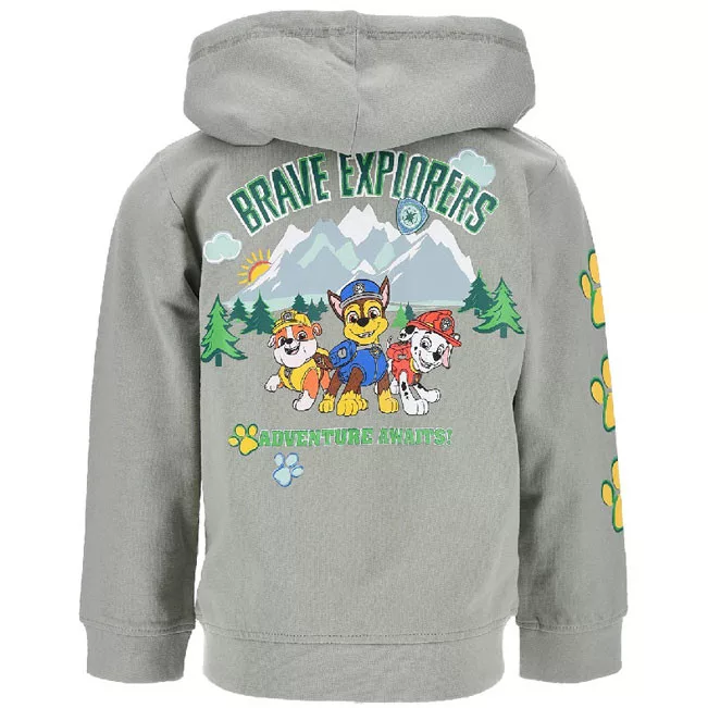 Puloverul Patrula Cățelușilor Mountain gri este creat pentru micii aventurieri. Realizat din bumbac bio, este moale, confortabil și prietenos cu pielea copiilor. Imprimeurile colorate cu Chase și mesajele „Adventure Awaits” și „Adventure is Calling” dau bluziței un aer jucăuș. Gluga practică, fermoarul pe toată lungimea și buzunarele frontale îl fac perfect pentru școală, grădiniță și joacă în aer liber.