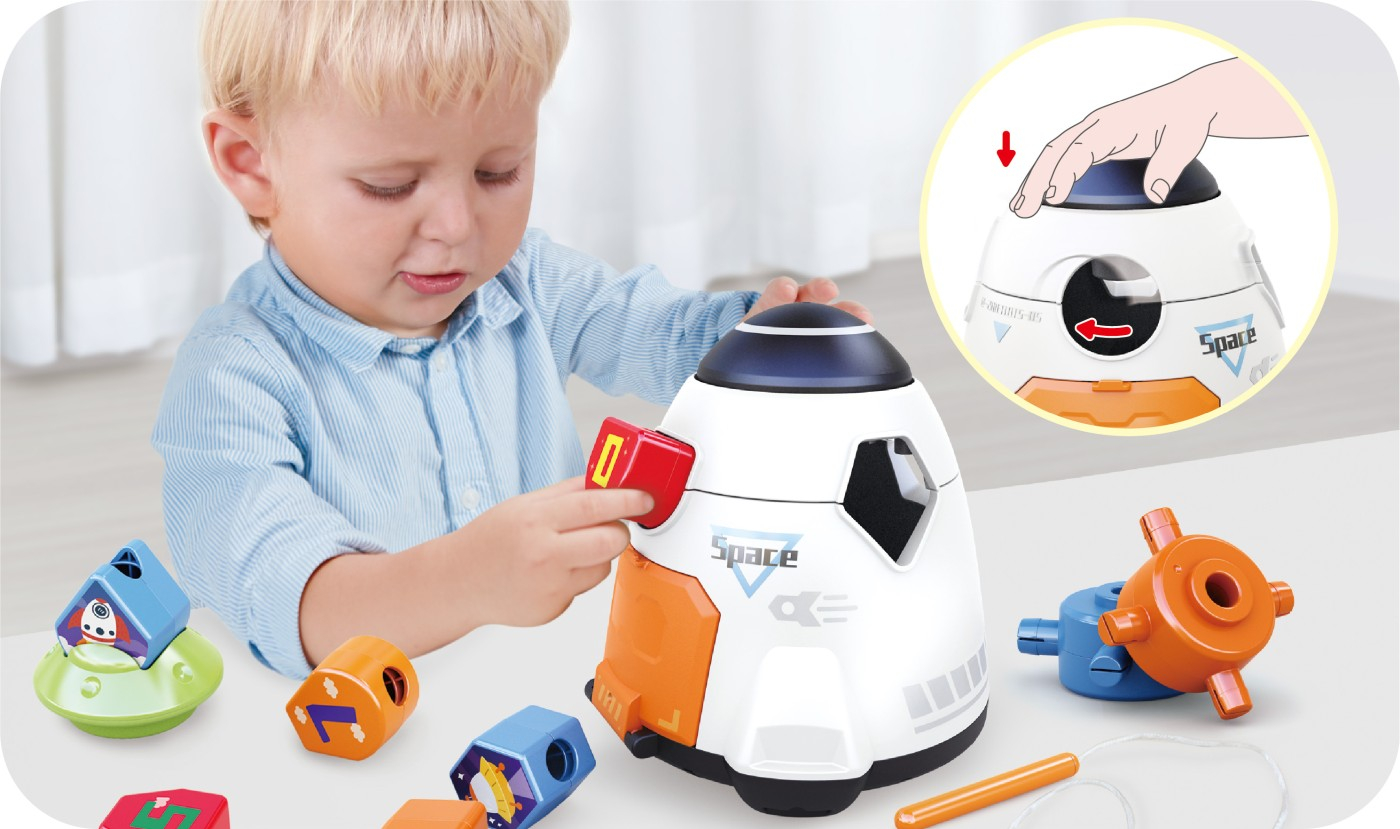 O nava spatiala frumoasa in care copiii pot alege caramizile si pot construi o varietate de forme si activitati diferite care le ajuta sa-si dezvolte imaginatia! Î nsirati formele puteti insira blocurile geometrice de-a lungul gaurilor unul cate unul, astfel incat copilul sa invete sa sorteze formele, sa recunoasca culorile si sa dezvolte coordonarea mana-ochi. Sortare forme invata grafica matematica cu jocul de potrivire a formelor. Apasati partea superioara a navei spatiale si capacul superior se va roti astfel incat gaurile din cabina sa isi schimbe forma. Asezati blocurile potrivite in gaurile cabinei pentru a invata recunoasterea formei.