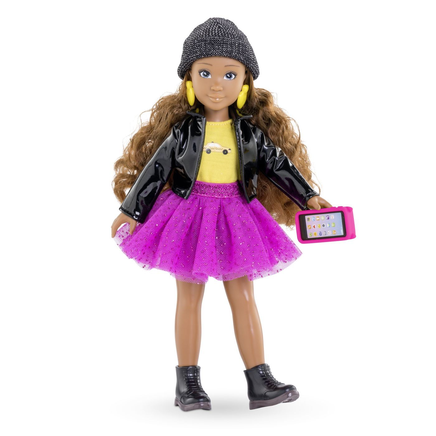 Setul Melody de la Saptamana Modei de la New York o include pe Melody, o papusa de moda de 28 cm si 5 accesorii 1 pereche de cercei detasabili, 1 telefon mobil, 1 husa pentru telefon mobil, 1 palarie si 1 geanta. Melody are o fata frumoasa, naturala, cu trasaturi fine care miroase a vanilie. Ochii ei sunt pictati si are parul lung, stralucitor, ondulat si saten. Poarta o fusta de tul, un tricou galben, o jacheta, o pereche de botine detasabile si o pereche de cercei detasabile. Melody are un corp realist de adolescenta si poate sta si sta in picioare