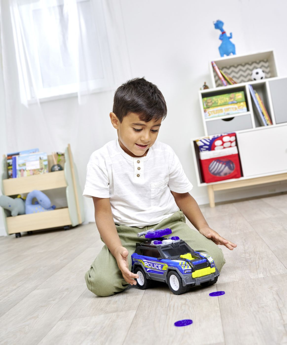 Niciun escroc nu este in siguranta de aceasta masina de jucarie cu functiile sale interactive si extra surprinzatoare, masina de politie de 30 cm lungime va dobori orice criminal. Echipat ideal pentru fiecare desfasurare tragatorul de discuri de pe acoperis trage cele 2 discuri incluse, care sunt proiectate cu motive de drona si apa. Sirena si luminile albastre sunt, desigur, o necesitate pentru fiecare masina de politie, completate de zgomote realiste de pornire a motorului si de conducere!