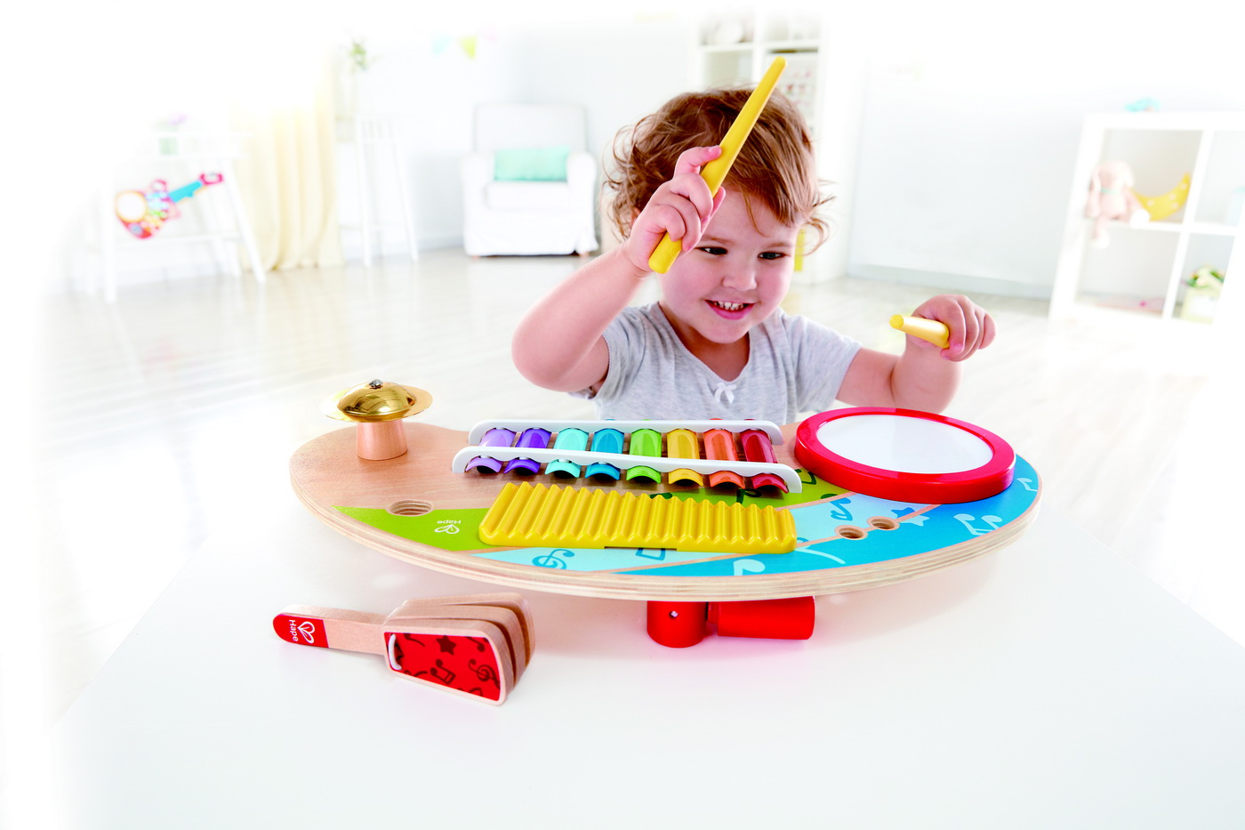 Copilul este pasionat de muzica? Sau de zornaitoare si alte jucarii care fac zogomot? Acest mini band este o solutie mult mai practica pentru a avea intr-un singur loc jucarii muzicale. Copiii vor invata sa faca muzica, vor invata diferentele de sunete intre diferitele instrumente muzicale si se va distra ore in sir. Jucaria muzicala de la HAPE este perfecta pentru copiii pasionati de muzica. Acestia se vor bucura de diversitatea instrumentelor muzicale incluse si a sunetelor. Acestia isi vor rafina auzul invatatnd diferentele intre sunetele ce provin de la fiecare instrument. Dimensiuni 44,5 x 10 x 21 cm Include tambur, xilofon, clapeta si doua bete. Tamburul are o suprafata de siliciu pentru un sunet mai moale si mai placut Sigur pentru urechile tinere conceput pentru a restrictiona emisia sunetului Copiii vor adora culorile si modelele stralucitoare Excelent pentru introducerea copiilor in combinatii sonore, dezvoltarea coordonarii mainii-ochi si a auzului Jucariile sunt realizate din lemn, folosind materiale ecologice, vopsite in culori atragatoare cu vopsele nontoxice, care depasesc cele mai inalte si stricte standarde internationale de siguranta si calitate, precum EN71, ISO9001, ASTM F963 si altele. De multi ani, Hape a creat jucarii fantastice, de inalta calitate, folosind materiale ecologice si durabile, fiecare produs fiind atent proiectat pentru a stimula abilitatile senzoriale, fizice si emotionale.