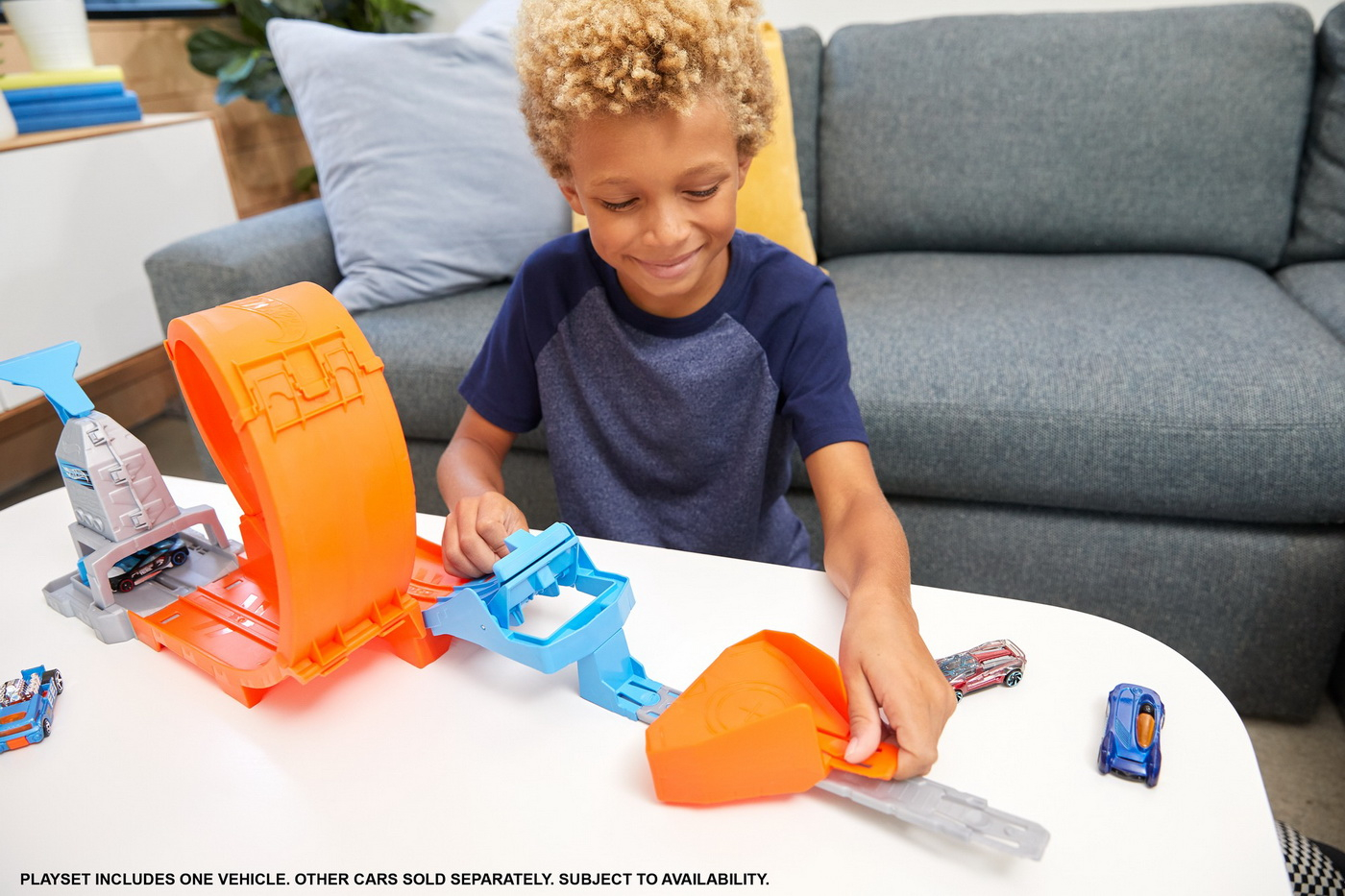 Testeaza abilitatile tale si prietenilor tai cu noile provocari de la Hot Wheels. Intra direct in actiune! Poti executa drifturi sau sarituri indraznete. Jucarie Pista Hot Wheels Champion GTV13, Mattel. O pista pentru campioni unde pilotii de cure isi pot testa abilitatile alturi de prieteni apropiati.Un circuit pentru profesionisti ce include 3 provocari o cursa de tractiune , o urcare indrazneata si un lansator cu maneta.Trageti de maneta si eliberati-o pentru a incepe numaratoarea inversa. Elemente de pista sunt compatibile cu alte seturi de pista Hot Wheels.Un set de joaca creativ ce dezvolta spiritul competitiv. Setul include si o masinuta de curse Hot Wheels exclusiva.