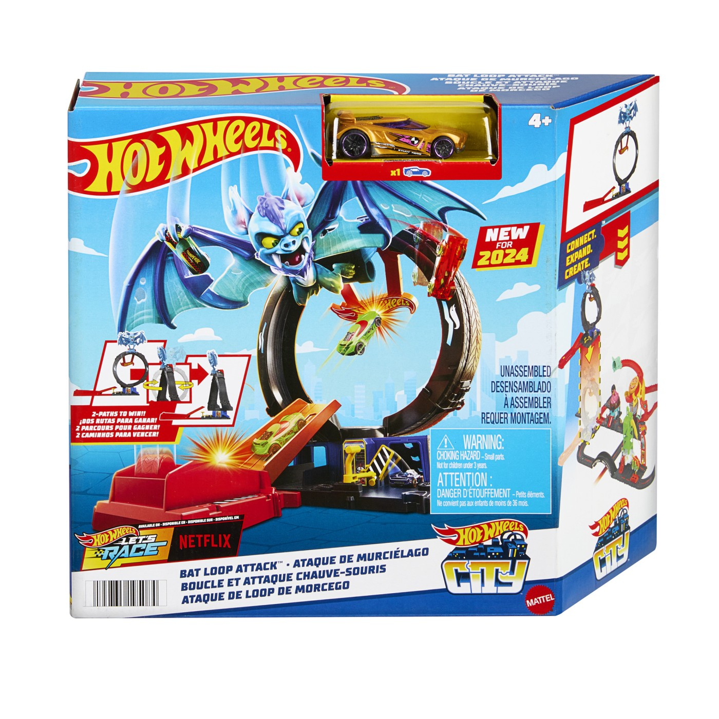 Creaturi fioroase au invadat locurile cunoscute din Hot Wheels City, formand obstacole palpitante si aventuri legendare pe care copiii sa le traiasca impreuna cu vehiculele lor Hot Wheels. Aceste seturi se conecteaza intre ele si cu alte seturi, astfel incat copiii sa isi poata construi propriul peisaj urban unic, plin de provocari si obstacole de inamic care inspira povesti creative prin joc de impins vor dori sa le colectioneze pe toate (fiecare se vinde separat). Include o masina Hot Wheels, astfel ca este un cadou excelent pentru orice ocazie. Culorile si decoratiunile pot varia. Bestii monstruoase s-au infiltrat in locuri cunoscute din Hot Wheels City, formand obstacole interesante si provocari palpitante care inspira aventuri nesfarsite cu cascadorii pentru masini de jucarie! Aceasta colectie cu inamici include un far, o benzinarie si o sectie de politie, cu creaturi gigantice ale caror brate si corpuri s-au transformat in piese de pista care se conecteaza intre ele, precum si la alte seturi Hot Wheels. Fiecare set se vinde separat, in limita stocului disponibil. Este inclus un vehicul Hot Wheels in fiecare set, pentru a porni imediat in aventuri pline de creaturi. Seturile de joaca Hot Wheels incurajeaza povestile creative si explorarea independenta prin joc de impins. Copiii cu varsta cuprinsa intre 4 si 8 ani se vor bucura de seturile de joaca bazate pe inamici, care sunt un cadou excelent. Pentru a elimina creatura, trebuie sa lansezi masinile prin bucla speciala sau sa reglezi atent bucla si lansatorul pentru a lovi liliacul in plin.